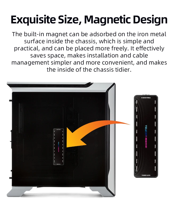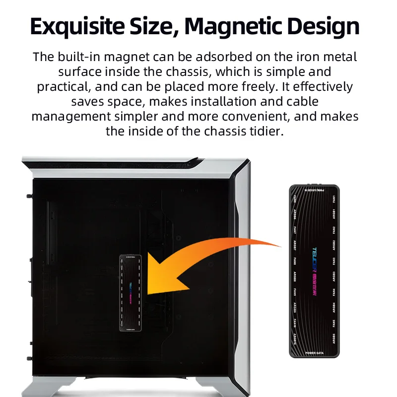 El imán incorporado se puede adsorber en la superficie metálica de hierro dentro del chasis, lo cual es simple y práctico, y se puede colocar más libremente.Ahorra espacio de manera efectiva, hace que la instalación y gestión de cables sean más simples y convenientes y hace que el interior del chasis sea más ordenado.