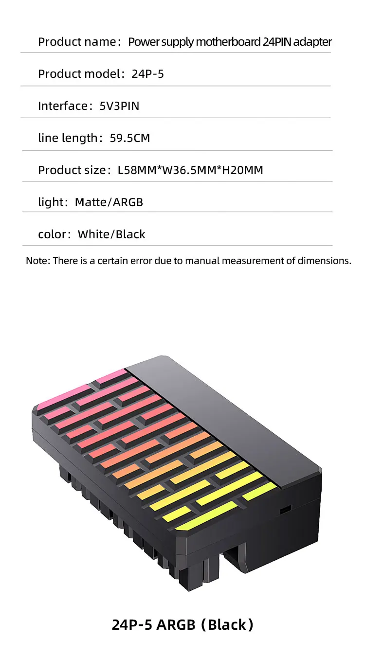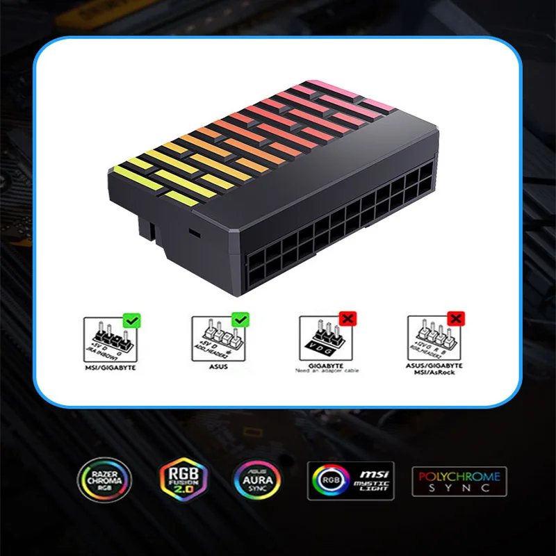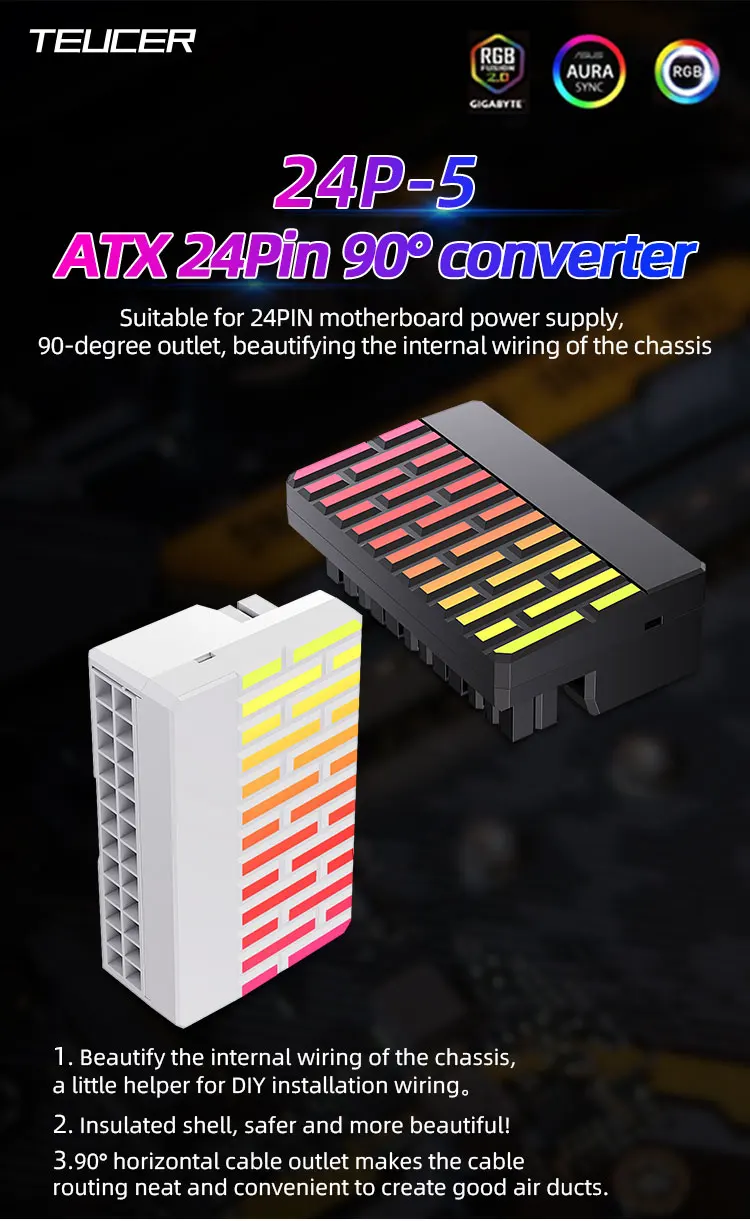 TEUCER 24P-5 ATX 24 pines conector de alimentación de 90 grados 5V 3 pines ARGB 24 pines hembra a macho adaptador de corriente de 90 grados DIY para PC de escritorio