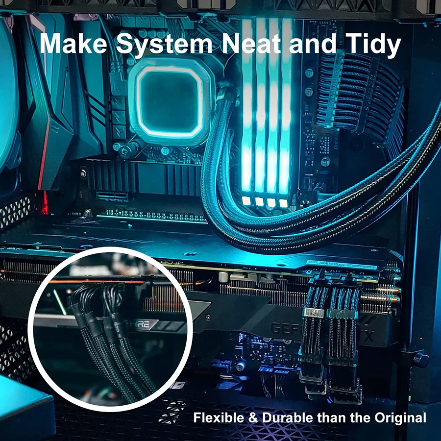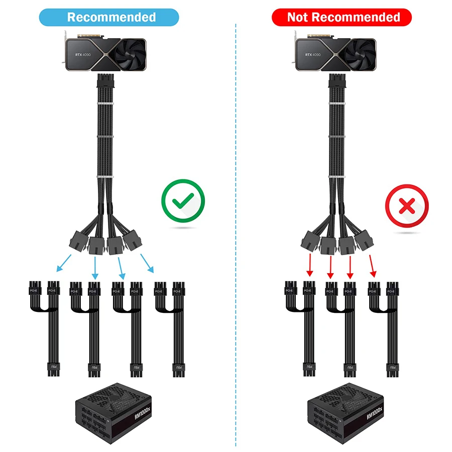 Fasgear PCIe 5,0 16(12 + 4)pin macho a 4X8(6 + 2)pin hembra cable de extensión de manga está diseñado para GeForce RTX 3090Ti, RTX 4080 y RTX 4090 GPU. Esto significa que este cable PSU puede extender la longitud y funcionar bien con el cable de alimentación original para obtener un rendimiento estable y confiable. Nota: Este cable extensor de manga GPU no es adecuado para GPU de 12pin GeForce RTX 3090 Series. Solo admite GPU hembra de 12 + 4 pines como las series RTX 3090Ti, RTX 4080, RTX 4090 y 4000.