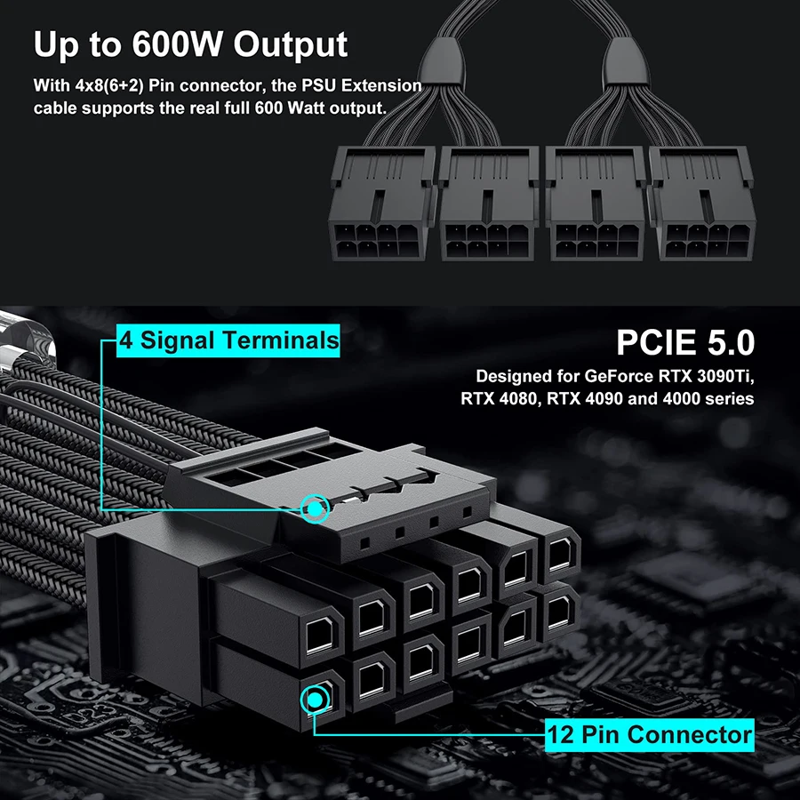 Fasgear PCIe 5,0 16(12 + 4)pin macho a 4X8(6 + 2)pin hembra cable de extensión de manga está diseñado para GeForce RTX 3090Ti, RTX 4080 y RTX 4090 GPU. Esto significa que este cable PSU puede extender la longitud y funcionar bien con el cable de alimentación original para obtener un rendimiento estable y confiable. Nota: Este cable extensor de manga GPU no es adecuado para GPU de 12pin GeForce RTX 3090 Series. Solo admite GPU hembra de 12 + 4 pines como las series RTX 3090Ti, RTX 4080, RTX 4090 y 4000.
