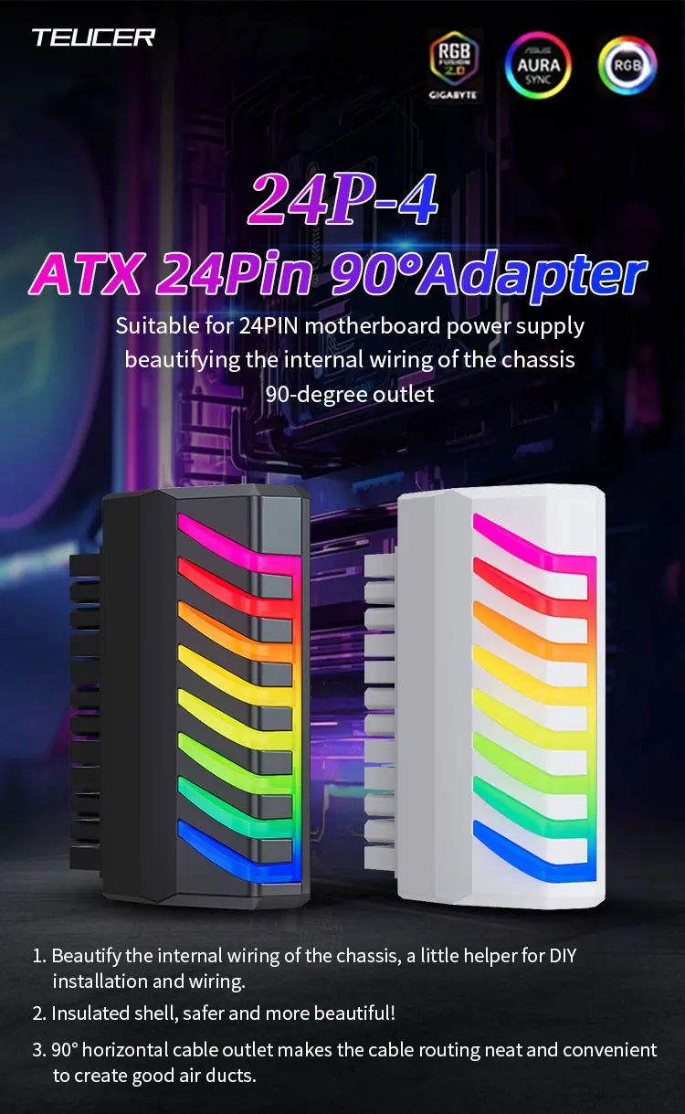 TEUCER-adaptador ARGB de 24 pines a 90 grados, Cable de fuente de alimentación de la placa base, accesorio de montaje Modular DIY, ATX, 24P-4