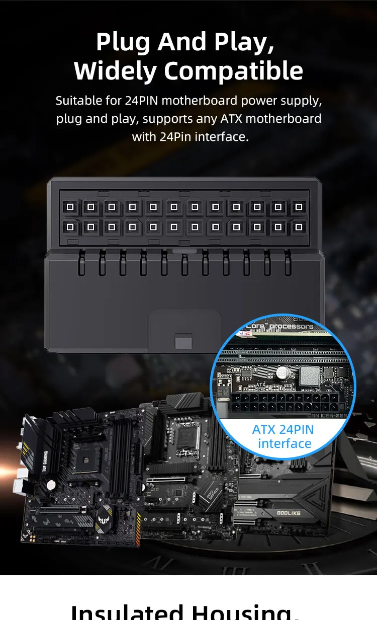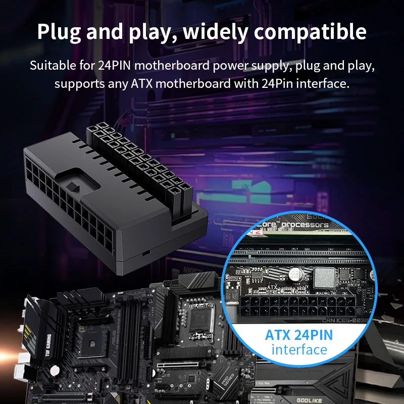 Adecuado para fuente de alimentación de placa base de 24 Pines, plug and play, compatible con cualquier placa base ATX con interfaz de 24 pines.