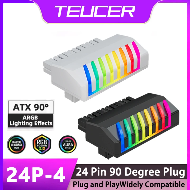 TEUCER ARGB Hub 24P4 adaptador de enchufe de alimentación ATX 24 pines a 90 grados Cable de alimentación de la placa base accesorio de montaje Modular DIY