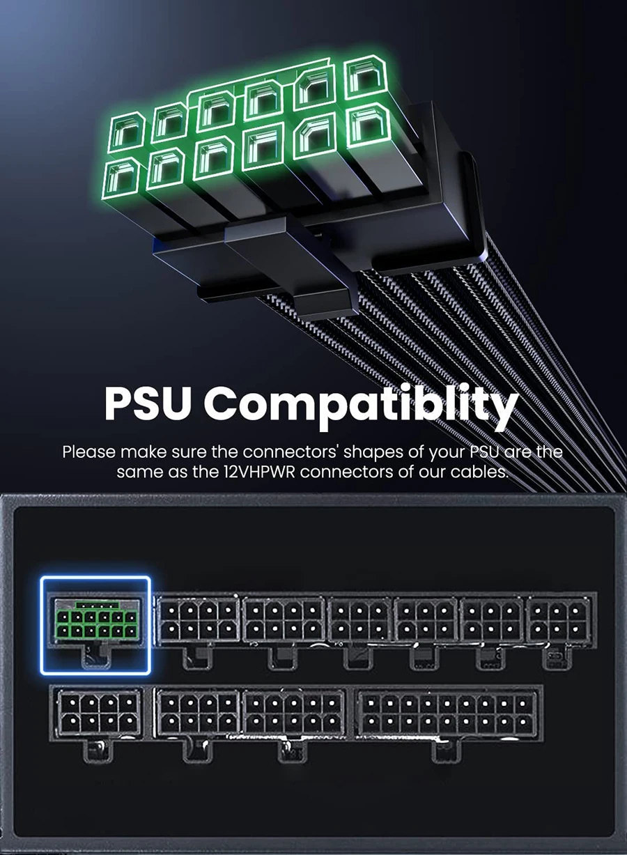 El cable de alimentación Fasgear PCI-Express 5,0 funciona bien. Es compatible con la fuente de alimentación modular con 12 puertos de alimentación VHPWR (como el PG5 de los modelos de la serie 1). Solo se necesita un cable de alimentación de 16 pines para alimentar la GPU directamente desde la PSU. Un Cable, simple, funciona bien y es bueno para ordenar. Prepárese para el futuro de la entrega de energía.