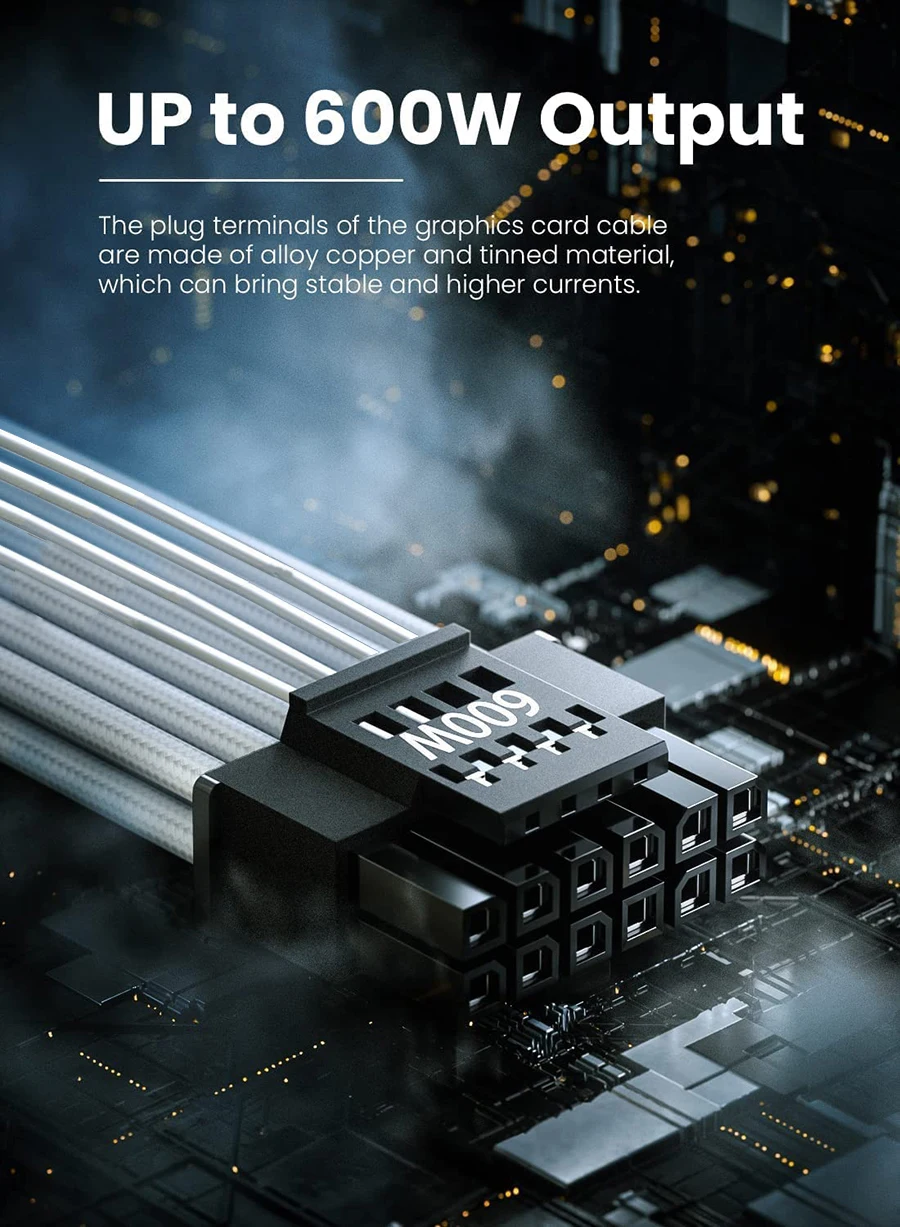 El cable de alimentación de la tarjeta gráfica Fasgear PCI-Express 5,0 admite una salida de hasta 600W ya que contiene cable de cobre estañado de 16AWG y enchufe de 12VHPWR fabricado en aleación de cobre estañado y material. En comparación con el cable de alimentación estándar de 18AWG, este cable de cobre estañado de 16AWG actualizado puede brindar una transmisión de voltaje estable y una mayor potencia de salida. Mientras tanto, este cobre estañado puede prevenir la oxidación.