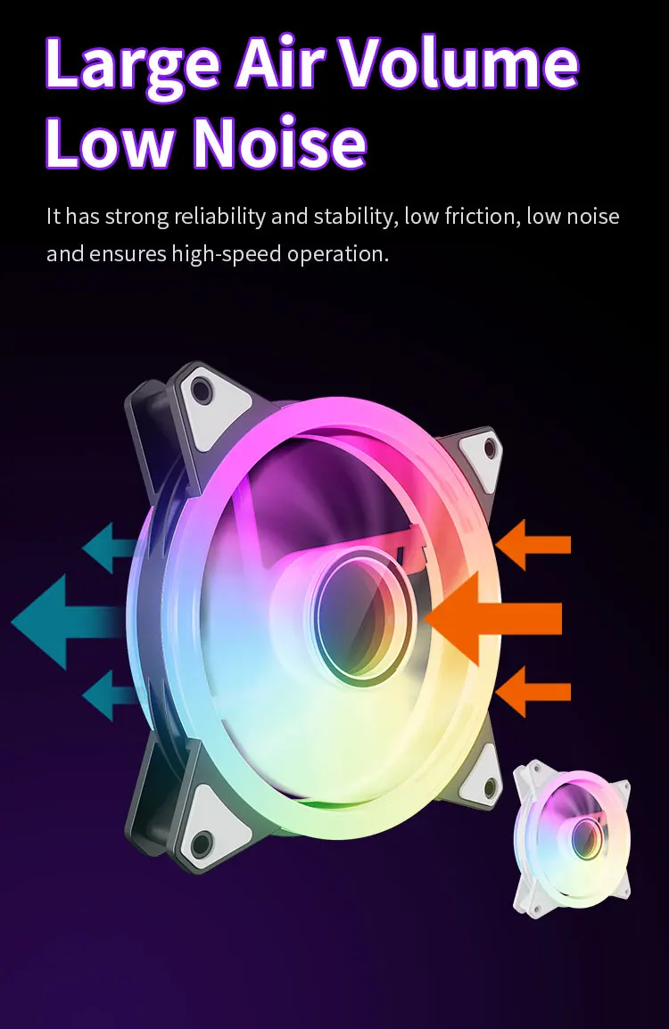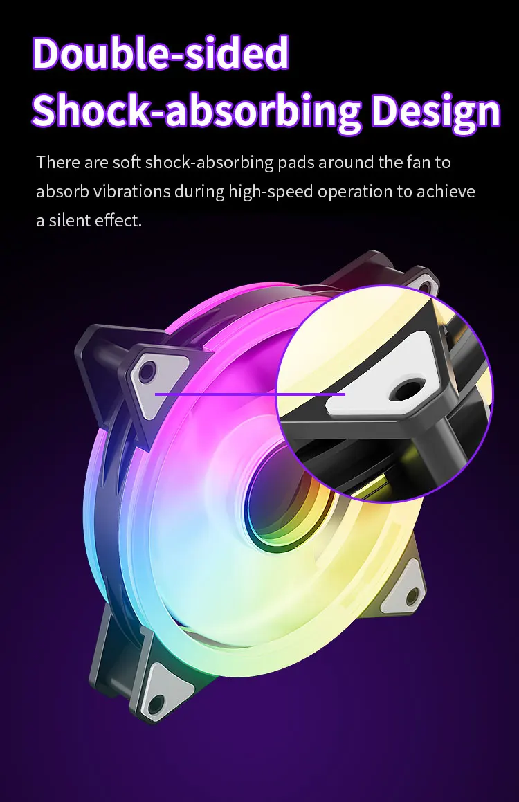 Hay almohadillas suaves que absorben los golpes alrededor del ventilador para absorber las vibraciones durante el funcionamiento a alta velocidad y lograr un efecto silencioso.