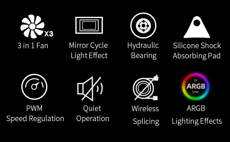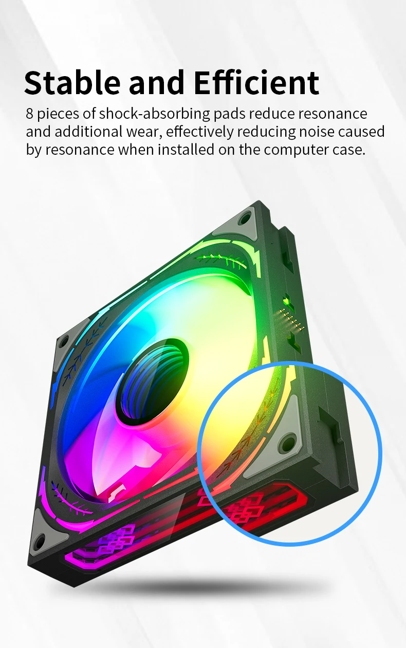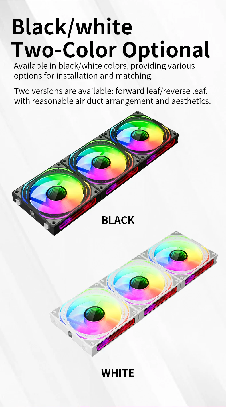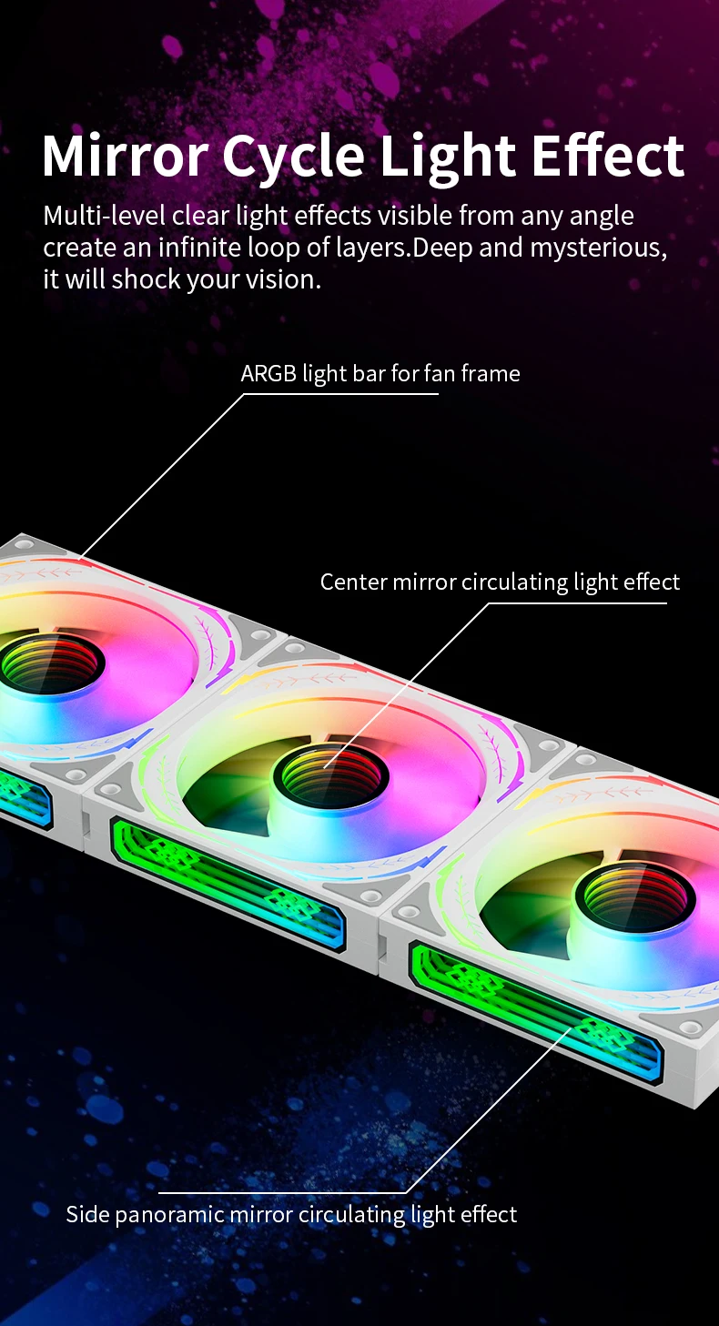El ventilador y el marco utilizan 8+16 cuentas de lámpara ARGB, y se agrega un efecto de luz de anillo de espejo a los marcos superior e inferior y al centro del ventilador, lo cual es adecuado para la sincronización de la luz de la placa base, lo que significa que las computadoras de bricolaje pueden ser más coloridas!