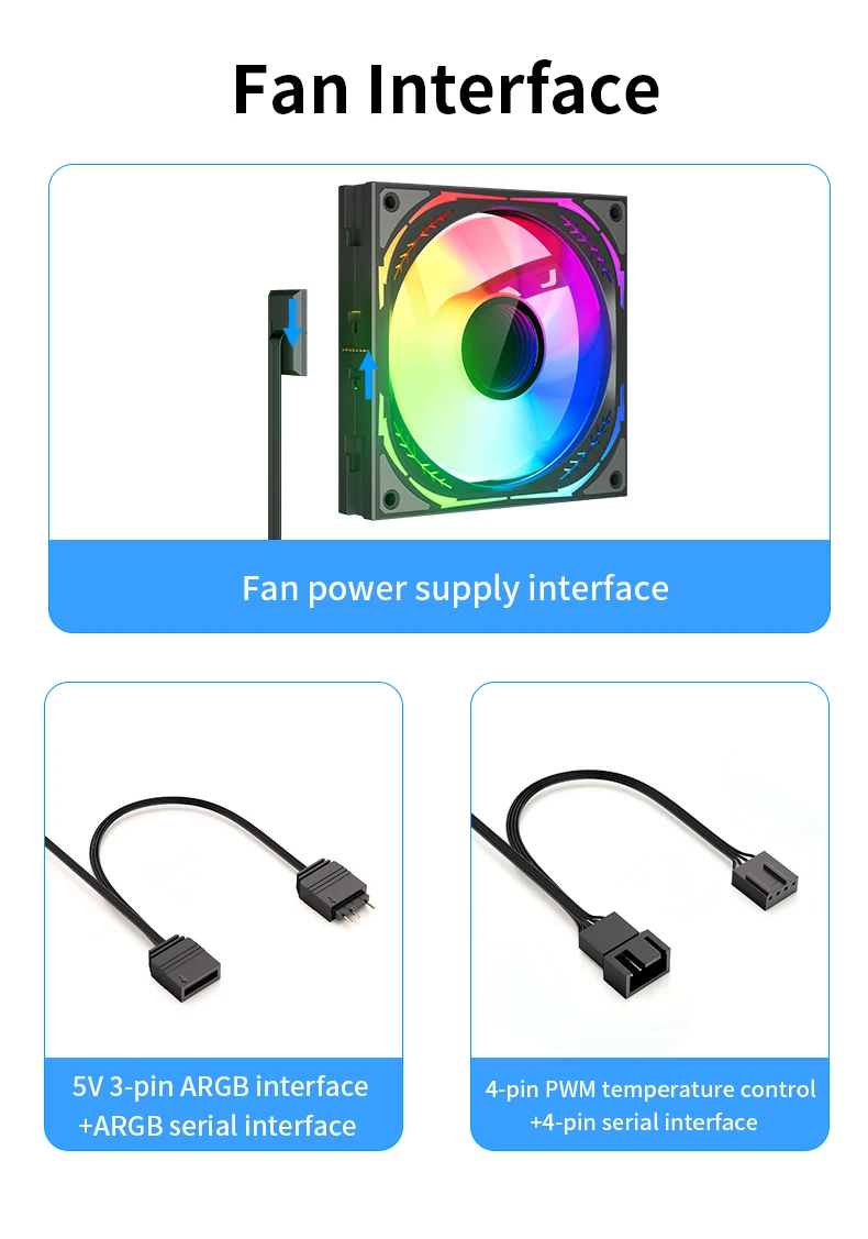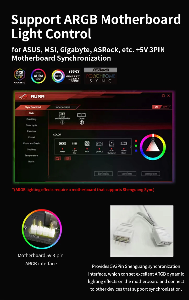 Admite sincronización de placa base ARGB, adecuada para ASUS, MSI, Gigabyte, ASRock, etc.+Sincronización de placa base 5V3PIN.