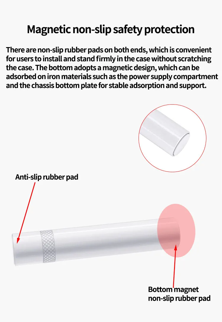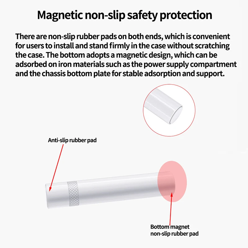 Magnetic non-slip safety protection. There are non-slip rubber pads on both ends, which is convenient for users to install and stand firmly in the case without scratching the case. The bottom adopts a magnetic design, which can be adsorbed on iron materials such as the power supply compartment and the chassis bottom plate for stable adsorption and support.