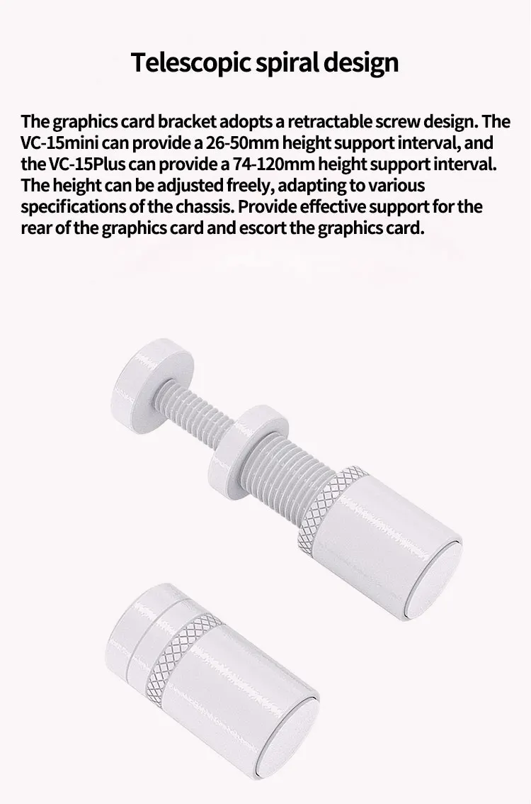 The graphics card bracket is designed with a retractable screw. The VC-15 Mini can provide a 26-50mm height support interval, and the VC-15 Plus can provide a 74-120mm height support interval. The height can be adjusted freely, adapting to various specifications of the chassis. Provide effective support for the rear of the graphics card and escort the graphics card.