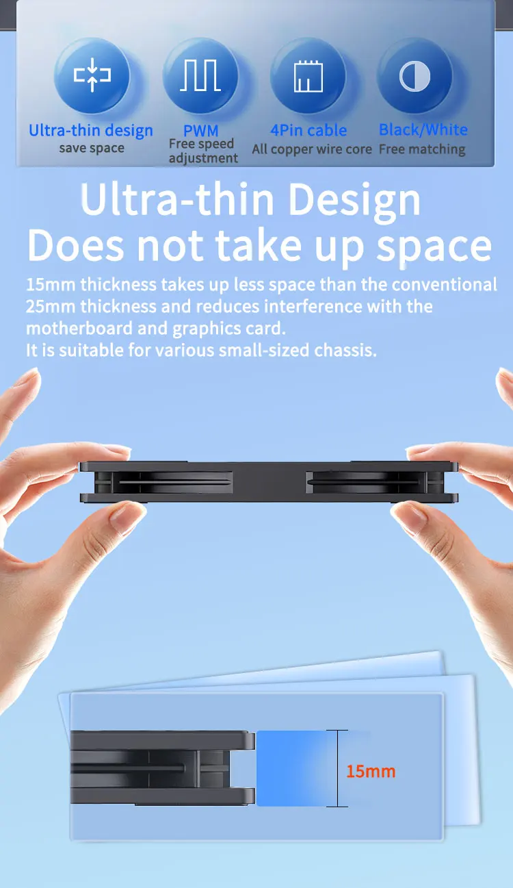Su delgado grosor de 15 mm permite una fácil instalación en espacios reducidos, mejorando la estética interna y el potencial de enfriamiento de su PC.