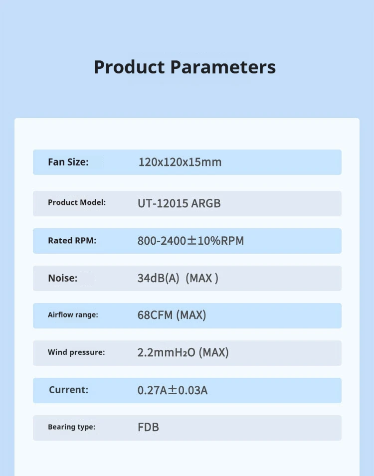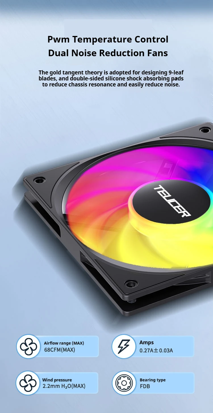 Diseño de alto volumen de aire, disipación de calor eficiente: el volumen de aire máximo alcanza los 68 CFM, proporcionando un flujo de aire eficiente, brindando a las computadoras un soporte de disipación de calor continuo y estable, especialmente adecuado para computadoras de alto rendimiento y escenarios de overclocking.