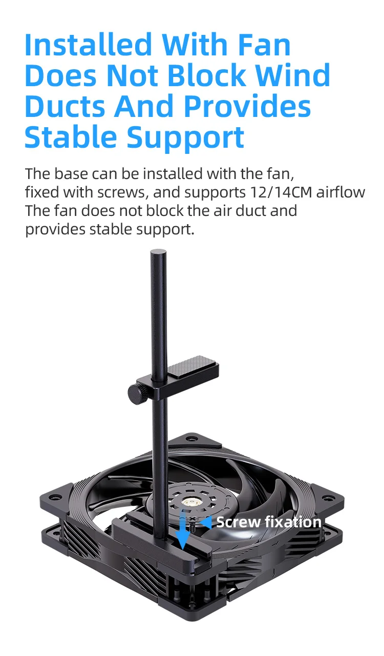 La base se puede instalar con el ventilador, fijarse con tornillos y admite un flujo de aire de 12/14 cm. El ventilador no bloquea el conducto de aire y proporciona un soporte estable.