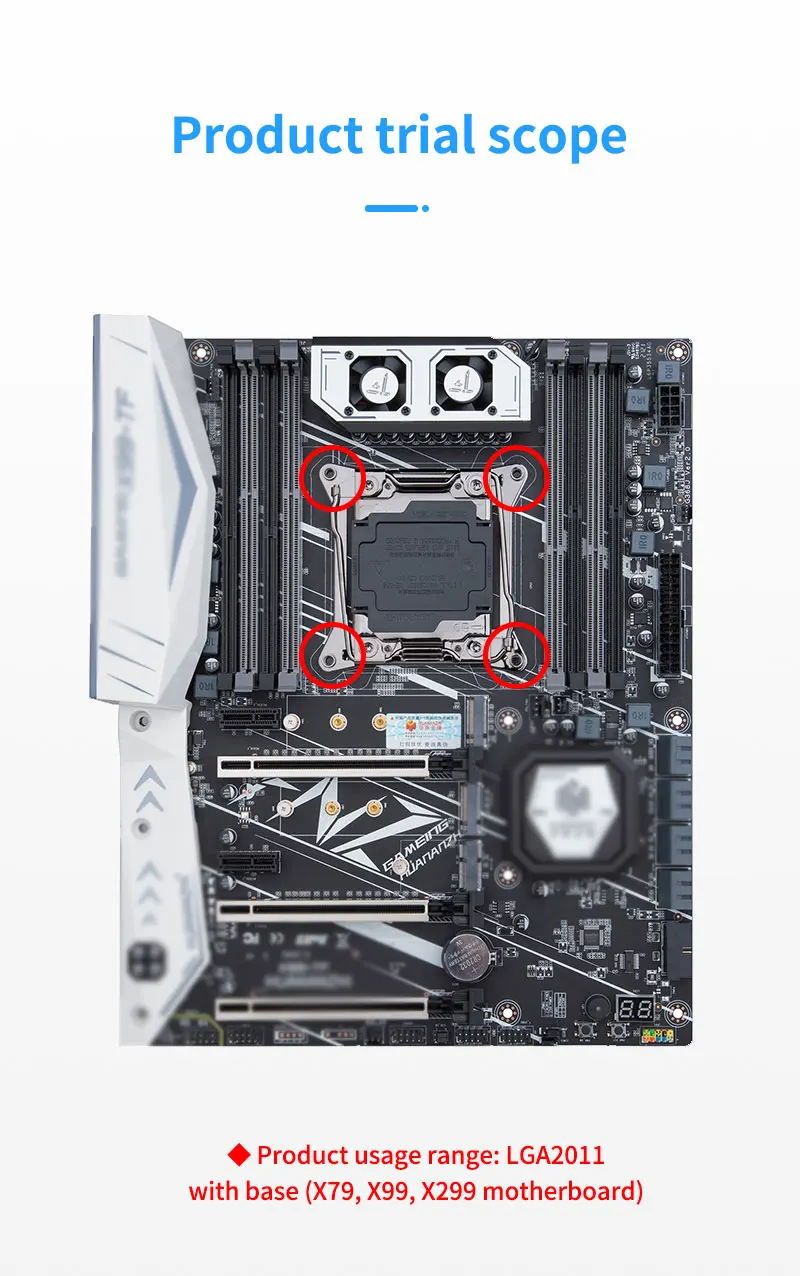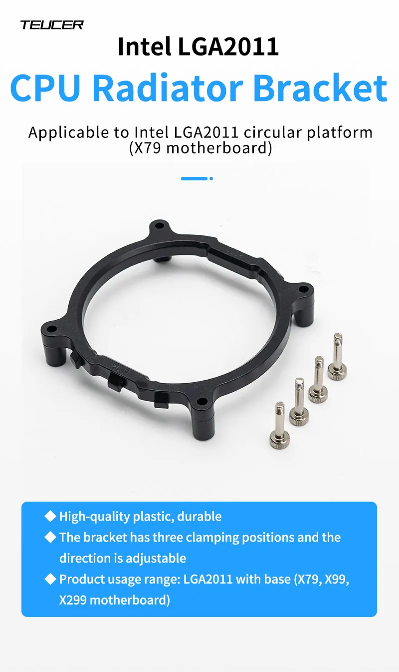 For Intel X79/X99/X299 Motherboard Socket LGA2011 CPU Radiator Base Shelf Pin Square Only applicable to intel Motherboard LGA2011 pins 80MM*80MM (Hole spacing 80mm) Packing List: LGA2011 Bracket *1 Screw *4