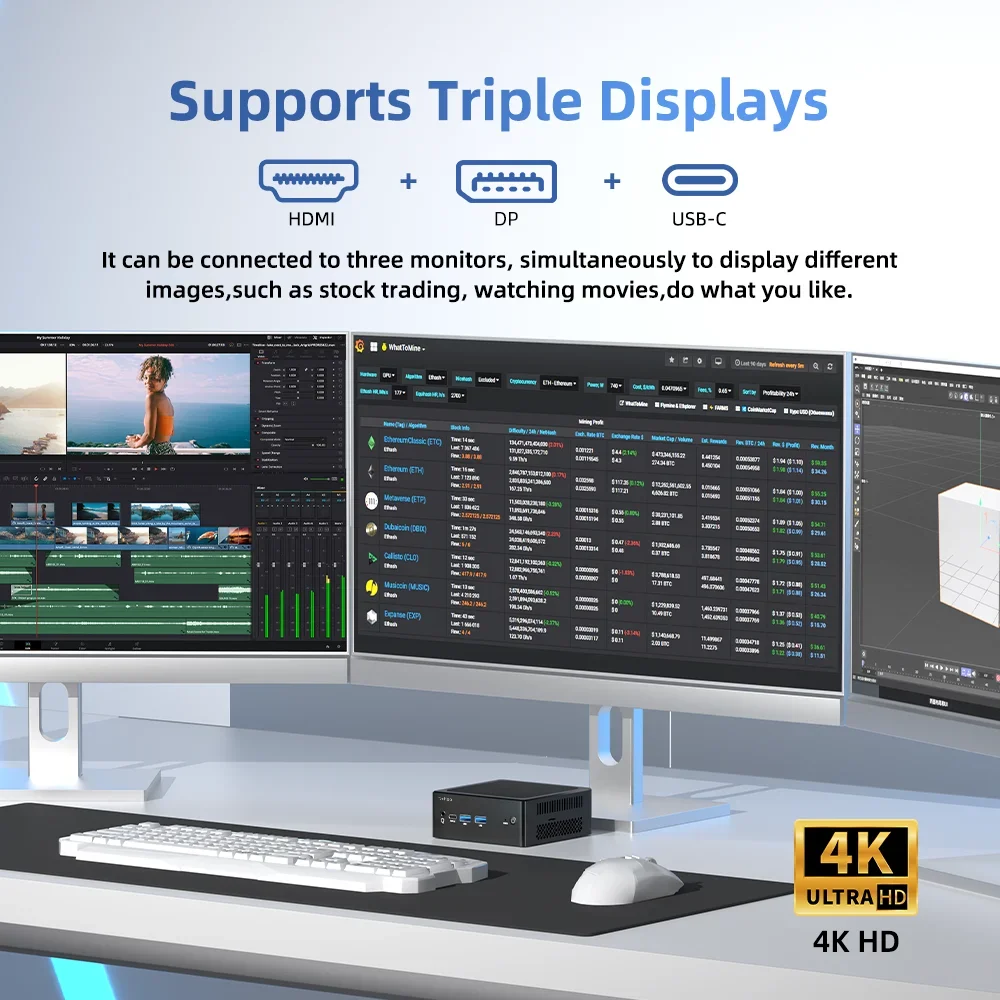 Se puede conectar a tres monitores, simultáneamente para mostrar diferentes imágenes, como negociar existencias, ver películas, hacer lo que quieras.