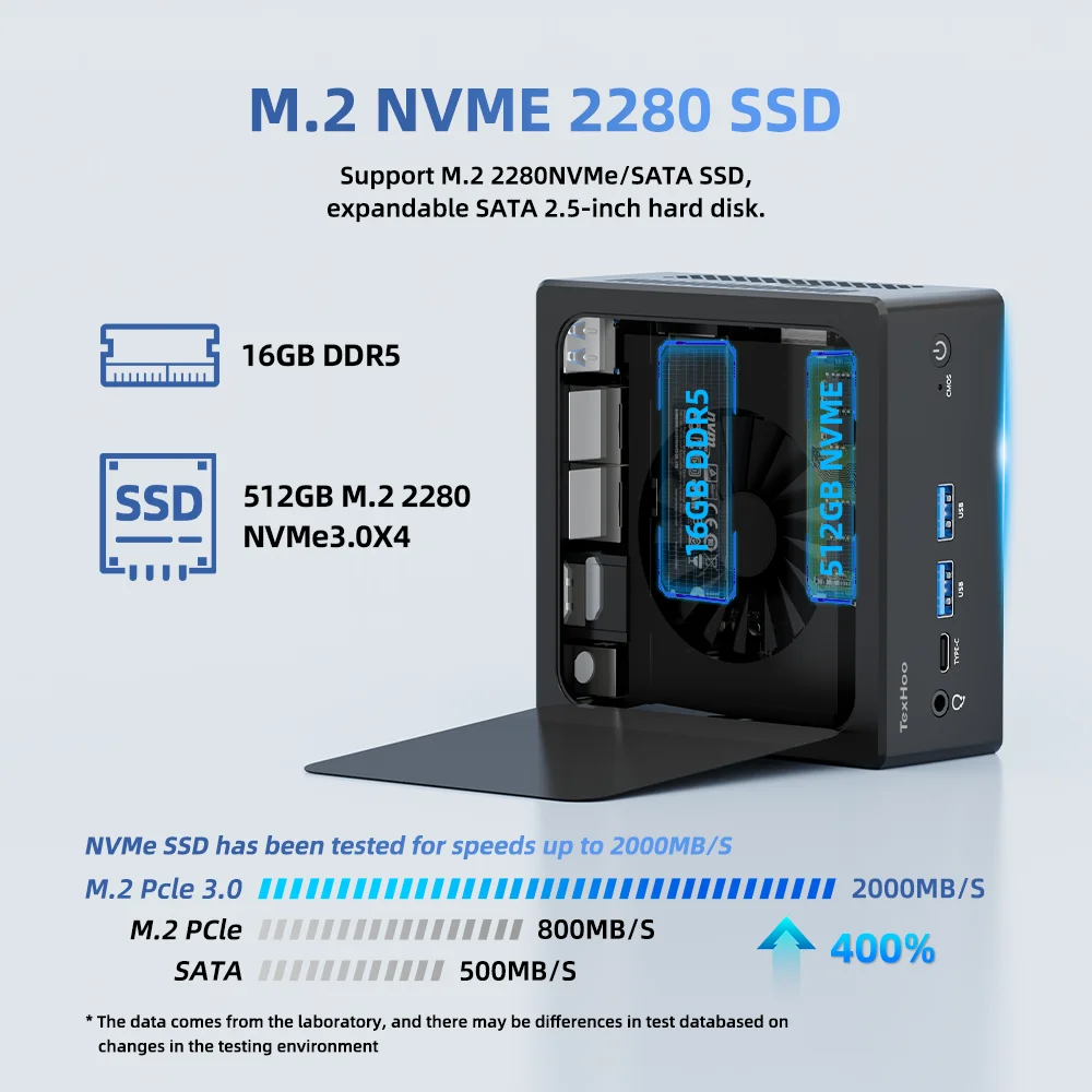 Equipado con SSD M.2 NVME 2280, compatible con M.2 2280NVMe, hasta 2 TB de almacenamiento, puede ampliar SSD SATA de 2,5 pulgadas