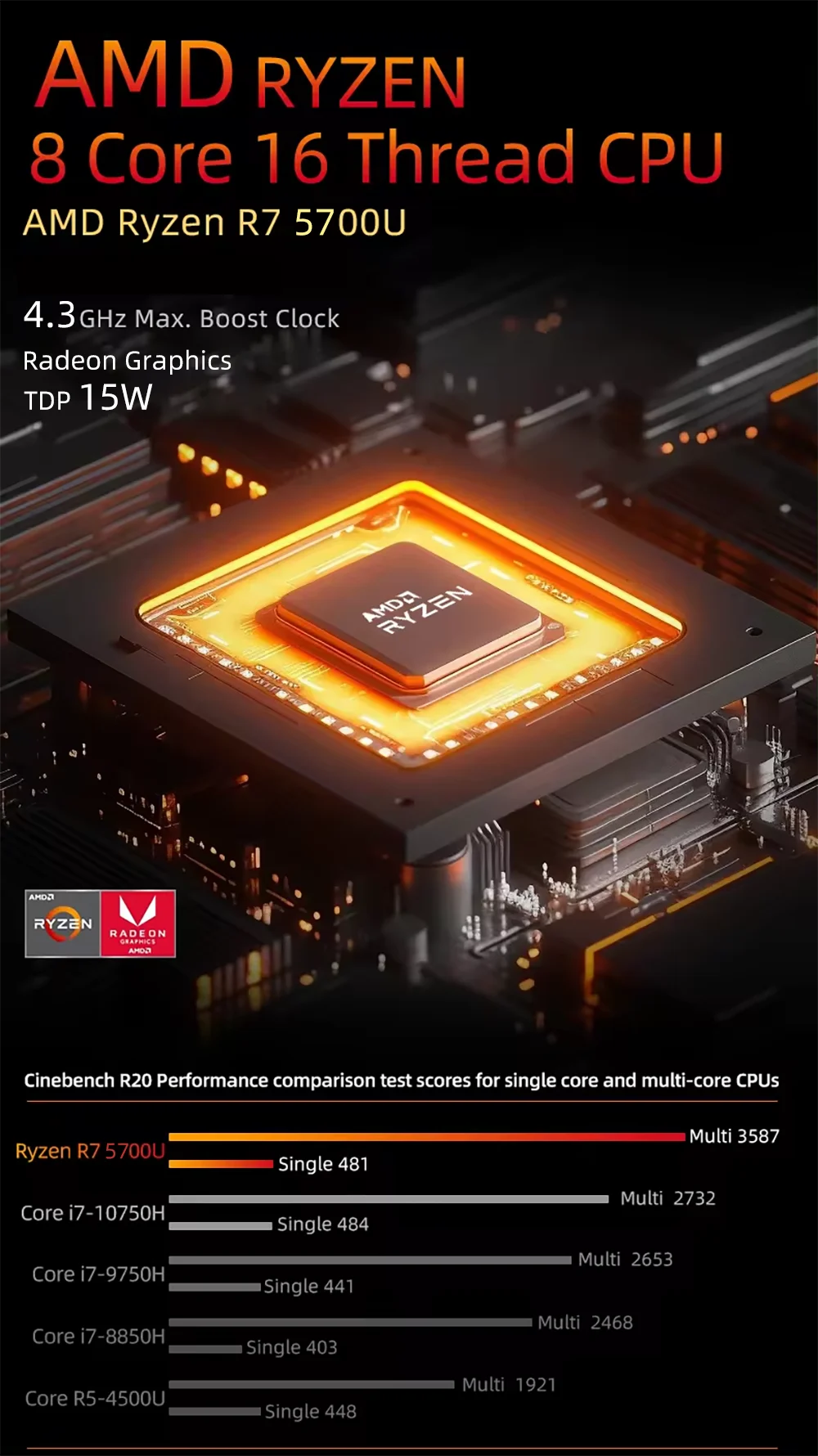 AMD Ryzen 7 5700U 8 núcleos 16 hilos 1,8 ~ 4,3 GHz Gráficos AMD Radeon 8 (Renoir)