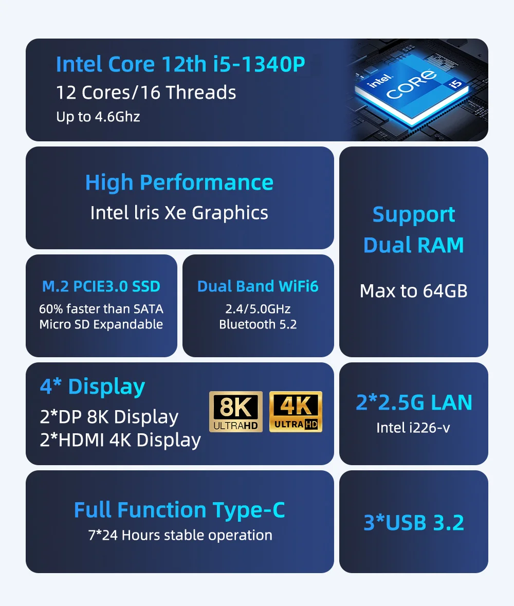 i5-1340P 12 núcleos 16 hilos 3,4 GHz ~ 4,6 GHz