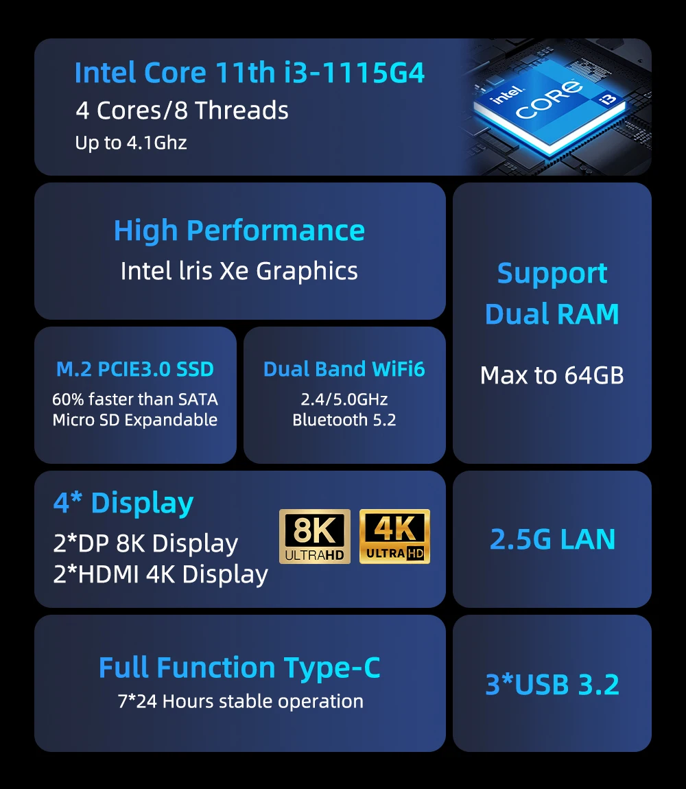 i3-1115G4 2 núcleos 4 hilos 1,7 GHz ~ 4,1 GHz