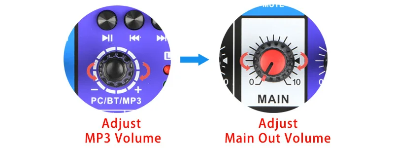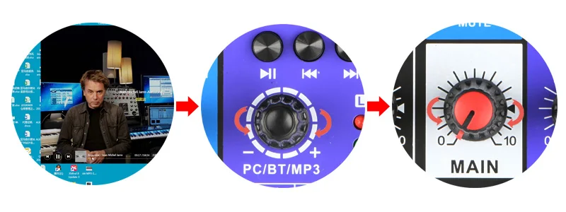 B) Gira la perilla PC/BT/MP3 para aumentar o reducir el volumen del ordenador al mezclador de audio