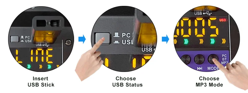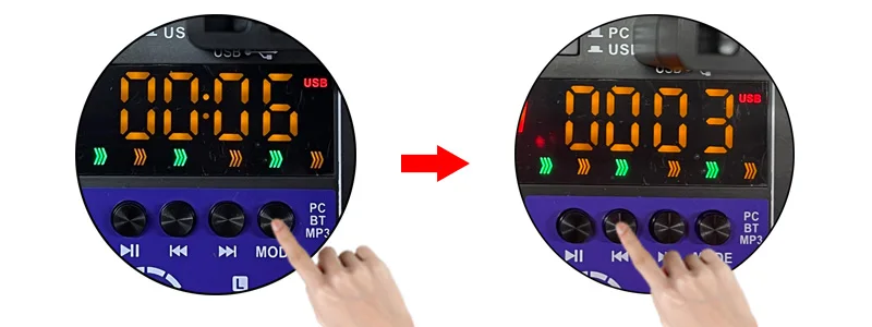 A) Gire la perilla de PC/BT/MP3 para aumentar o reducir el volumen USB