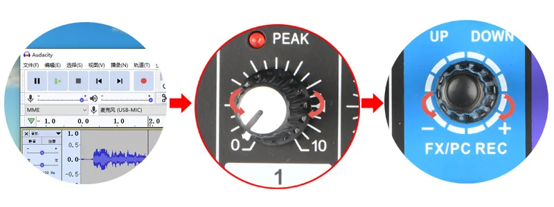 C) Gire la perilla de volumen del canal y la perilla FX/PC REC para ajustar el volumen de la grabación.