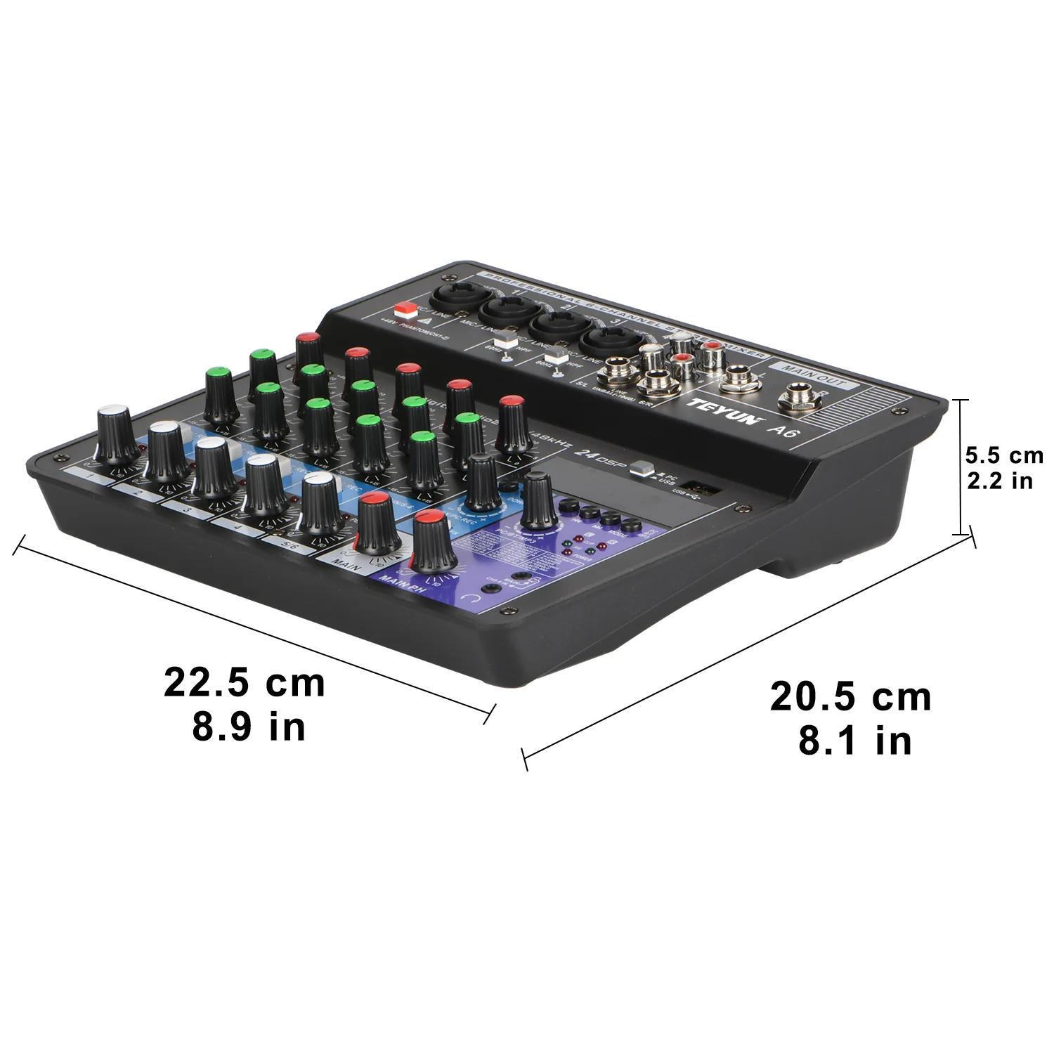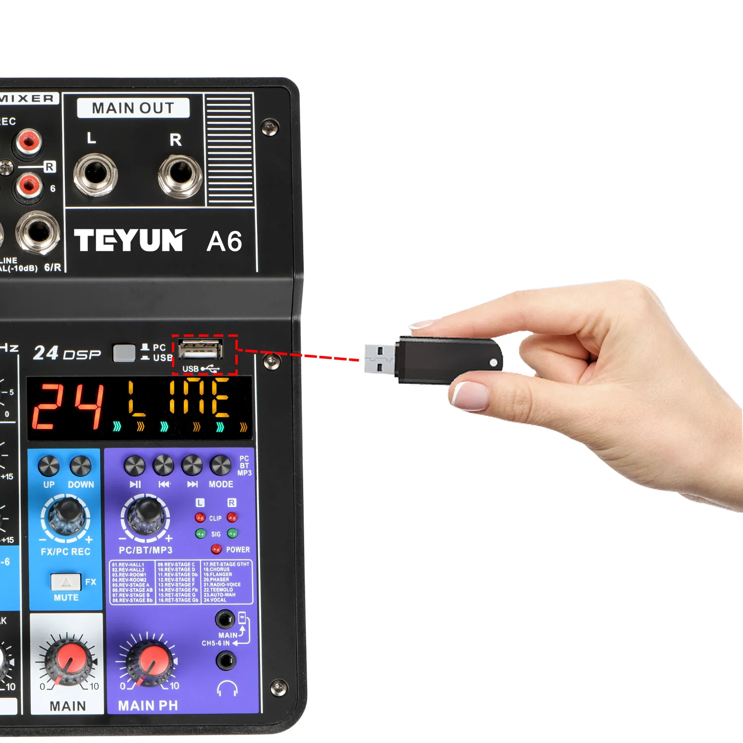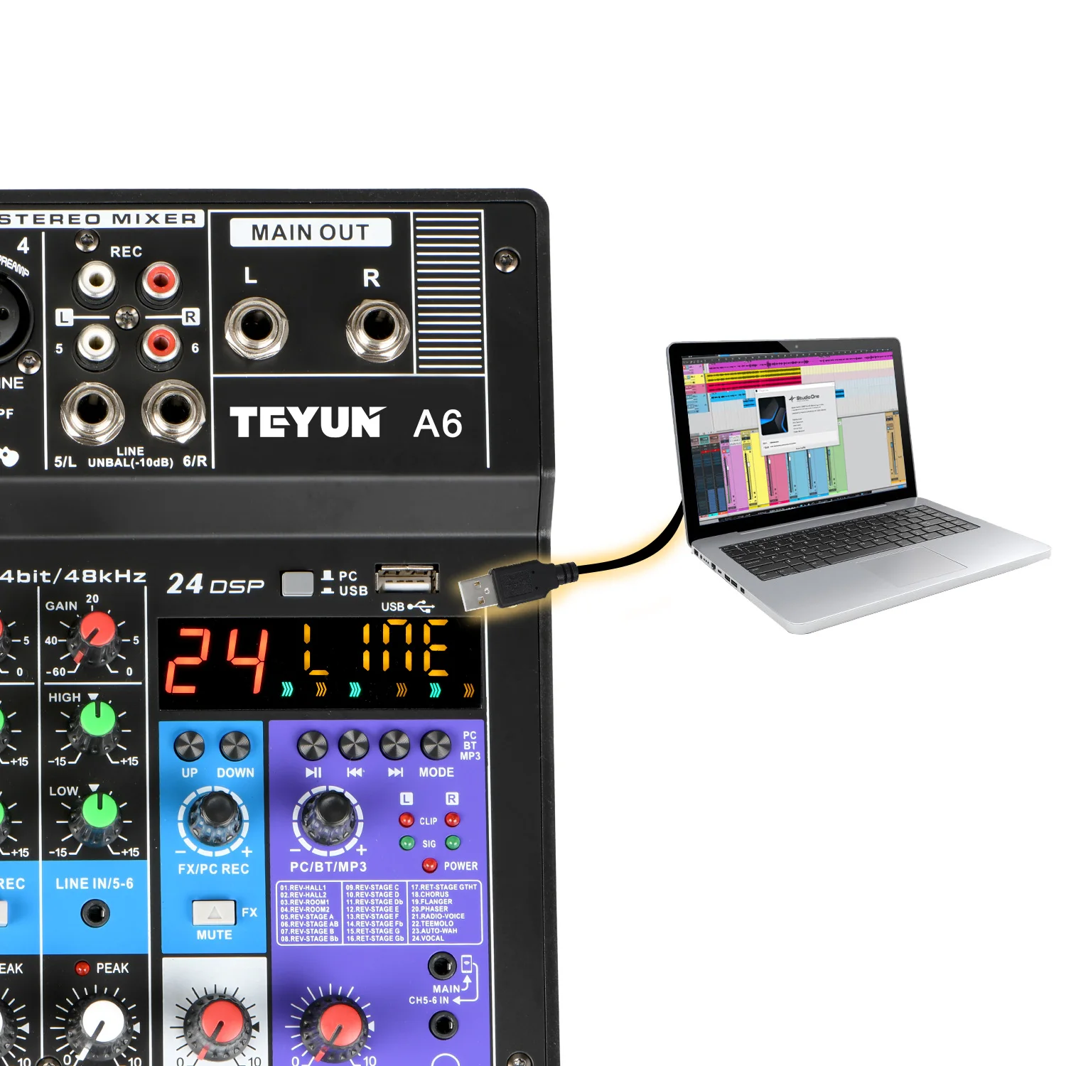 TEYUN-Mezcla de sonido A6, 6 CANALES, Bluetooth, USB móvil, reproducción de ordenador, 24 efectos DSP, mini mezclador de audio portátil para estudio de guitarra, transmisión de grabación