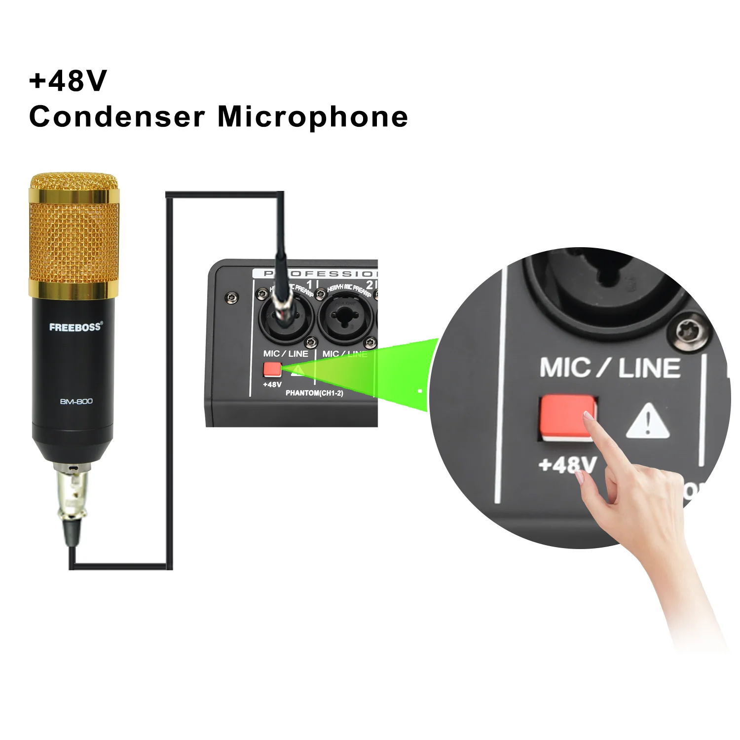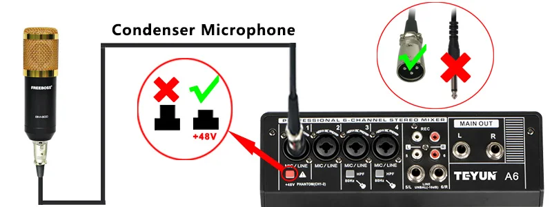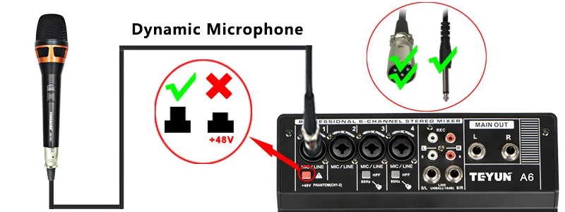 Cuando use un micrófono dinámico, no encienda el fantasma de + 48V, de lo contrario el micrófono dinámico puede quemarse.