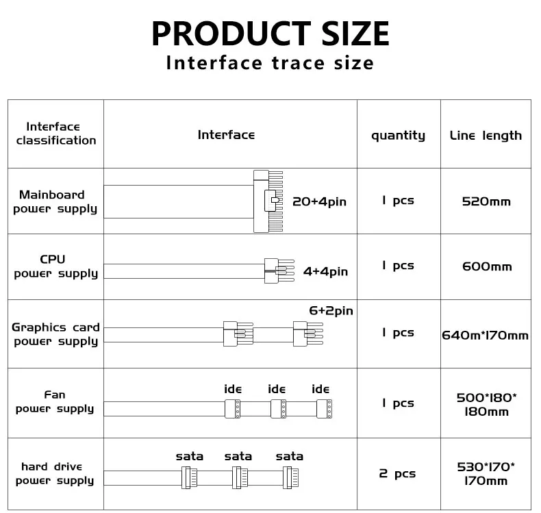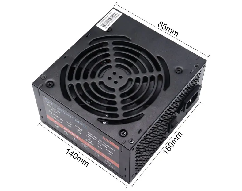 Tamaño: 150x150x85mm. Factor de forma ATX estándar. Interfaz de placa base de 20 + 4 pines, interfaz de CPU de 4 + 4 pines, PCIe de 6 + 2 pines. Admite CPU dual.