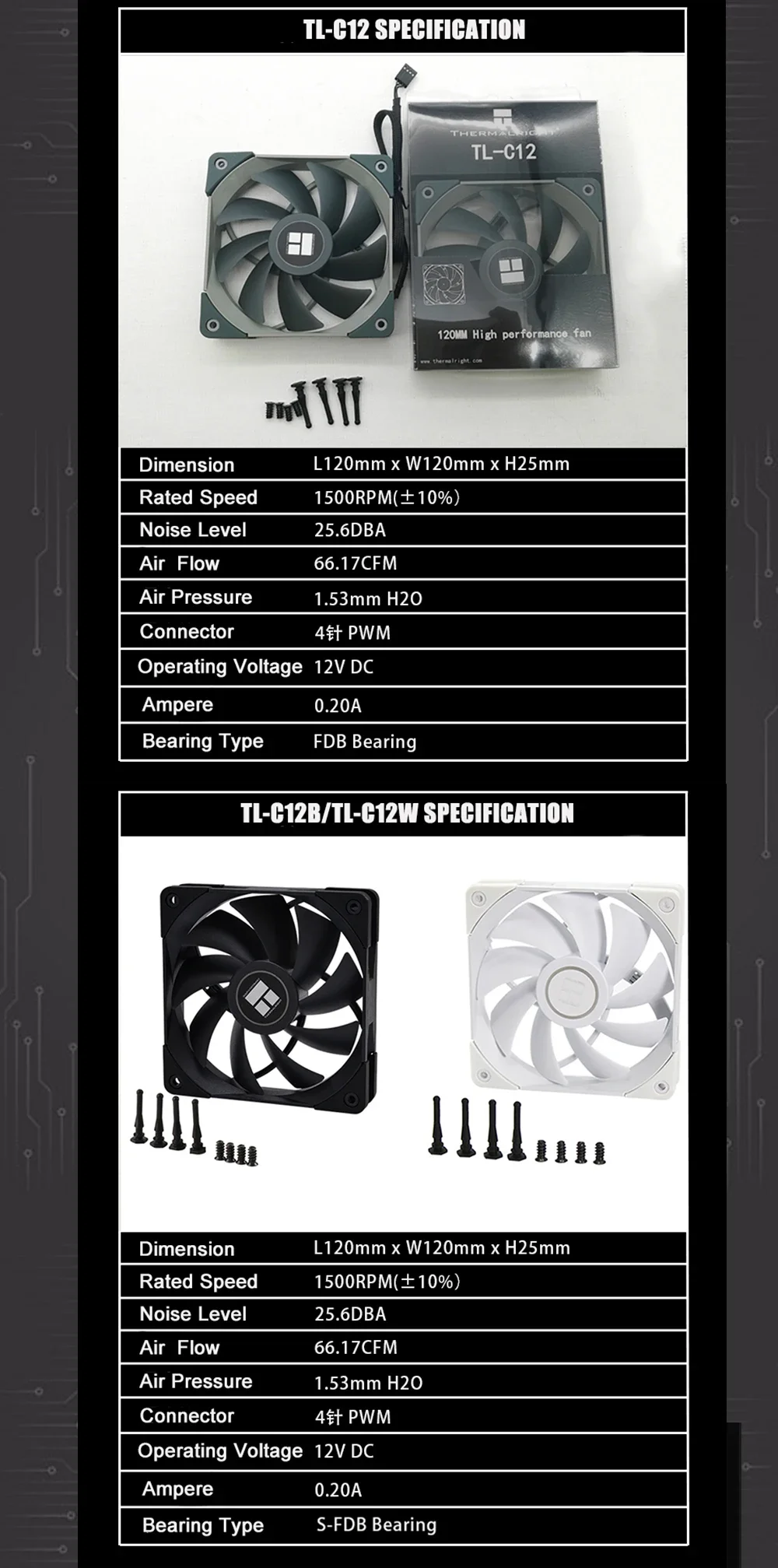 Termalright 120mm PWM PC Case Ventiladores de refrigeración 12cm, CPU Cooler Radiator 1500RM Sistema de disipación de calor refrigerado por aire Negro/BlancoTL-C12