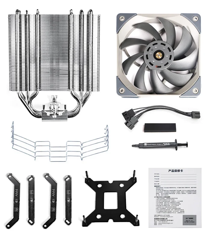Radiador X1 EX: 1 ventilador X1; placa posterior LGA115X X1; soporte Intel X2; soporte AMD X2; hebilla de ventilador X4; columna de goma X4; perno LGA20XX X4; tuerca X4; tornillo AM4 X4; pasta de conducción de calor TF7 X1; Un punto, dos líneas X1; Amortiguador X1; Manual X1; Tarjeta de garantía del producto X1.