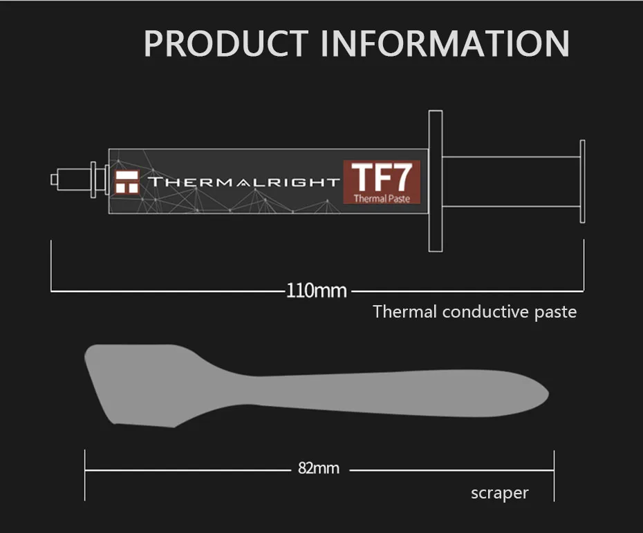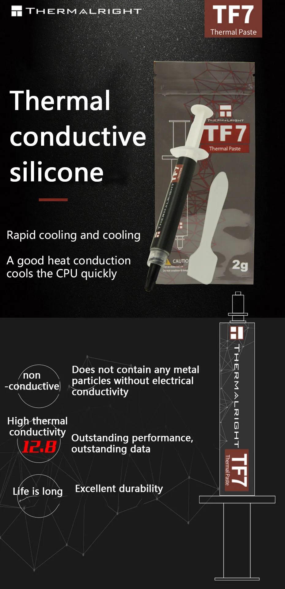 Conductividad térmica (W/m-k): 12,8Color: grisImpedancia térmica (℃-cm2/W): 0,01Gravedad específica (25℃):2.8Rango de temperatura utilizable: -150℃ / 250℃Contenido: 2gElectricamente conductor: NOInofensivo: SÍ