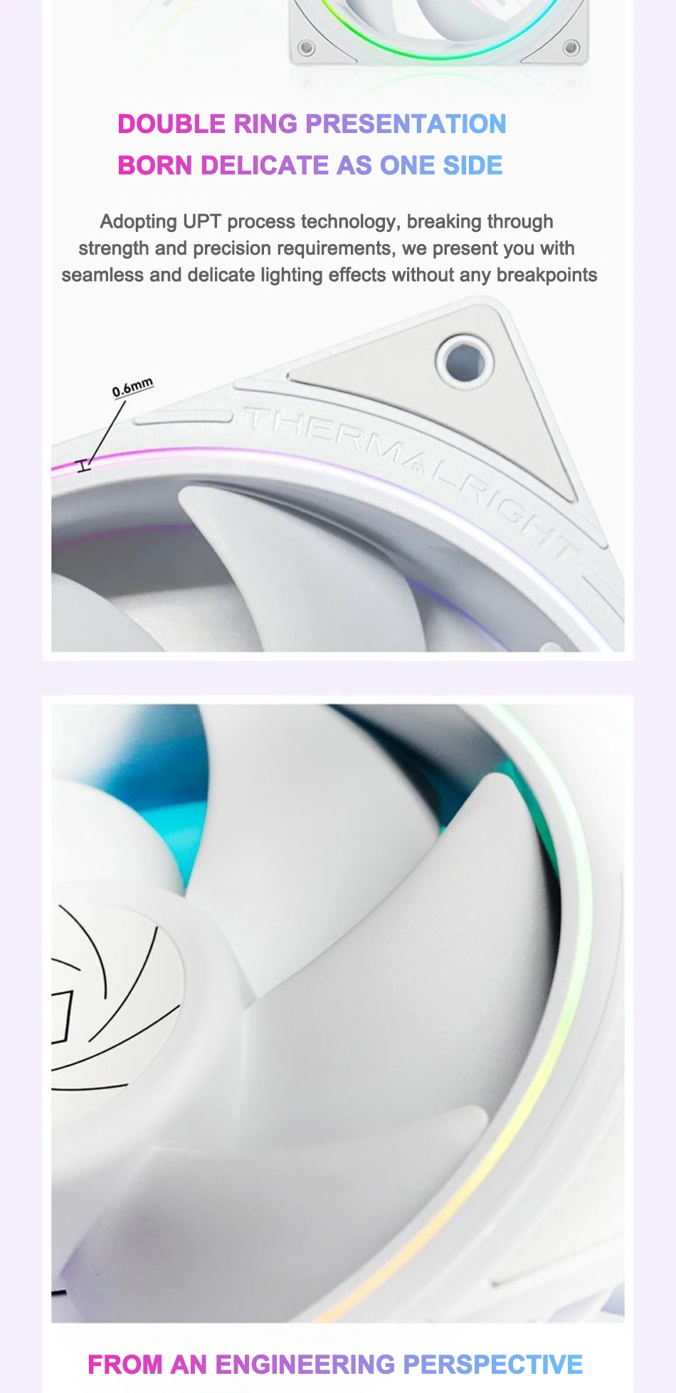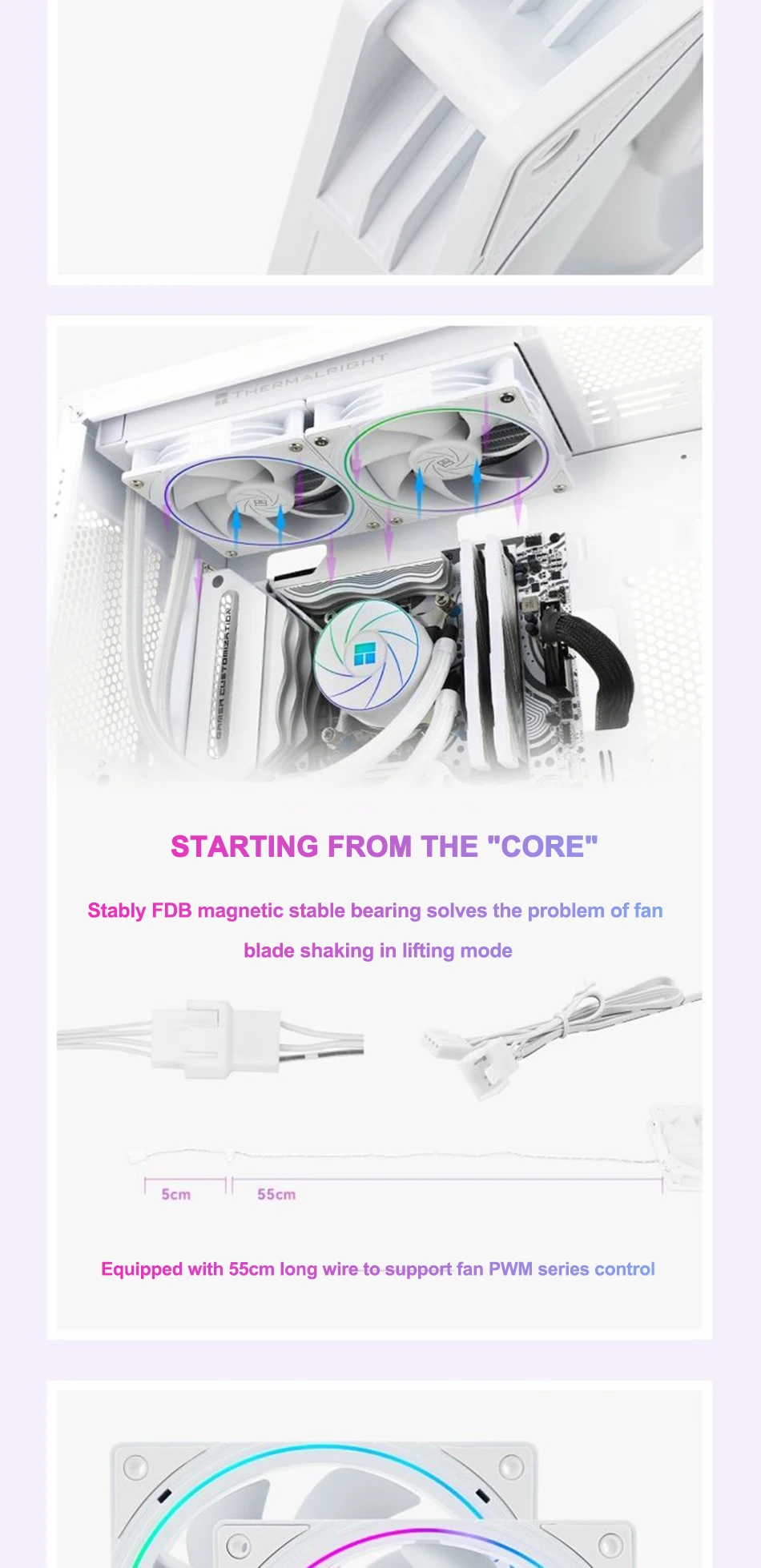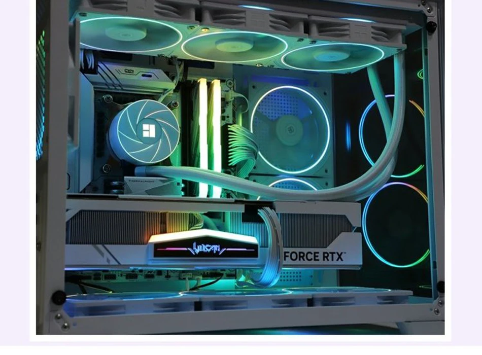 Los ventiladores son más que perfectos, todo es ajustable a través de PWM, silenciosos y (para mí, lo más importante) no tienen un gran anillo de arco iris en un lado, sino un anillo de iluminación delgado de doble cara. Este criterio y la disponibilidad de una versión reversible jugaron un papel clave en la elección para la ventilación del case.