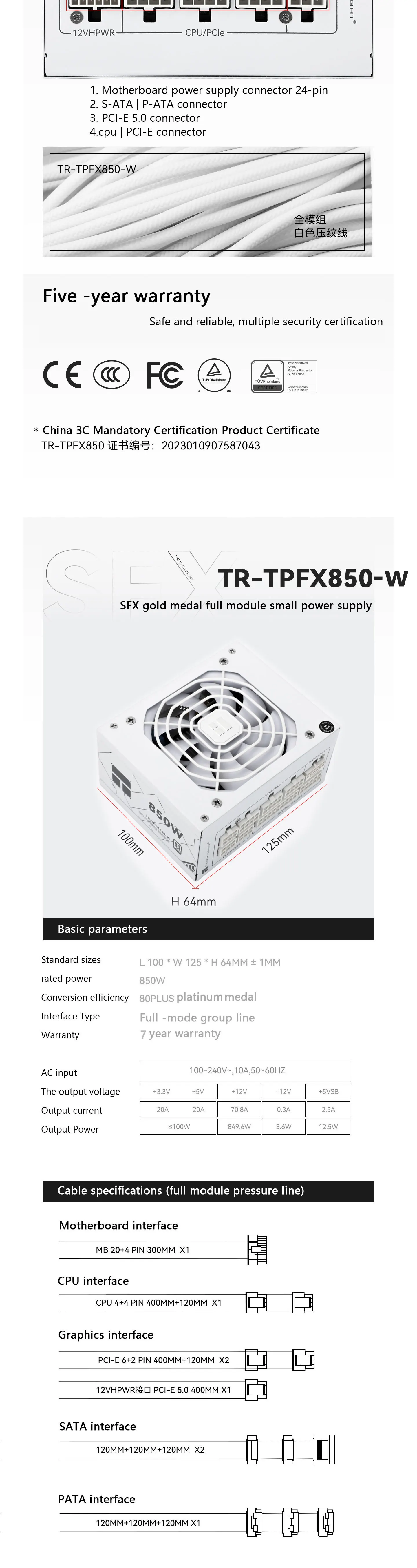 Thermalright-TR-TPFX850 Medalla de Platino SFX, módulo completo, caja de ordenador, fuente de alimentación, compatible con ATX3.0 /pcie5.0 (750/850 W), color blanco