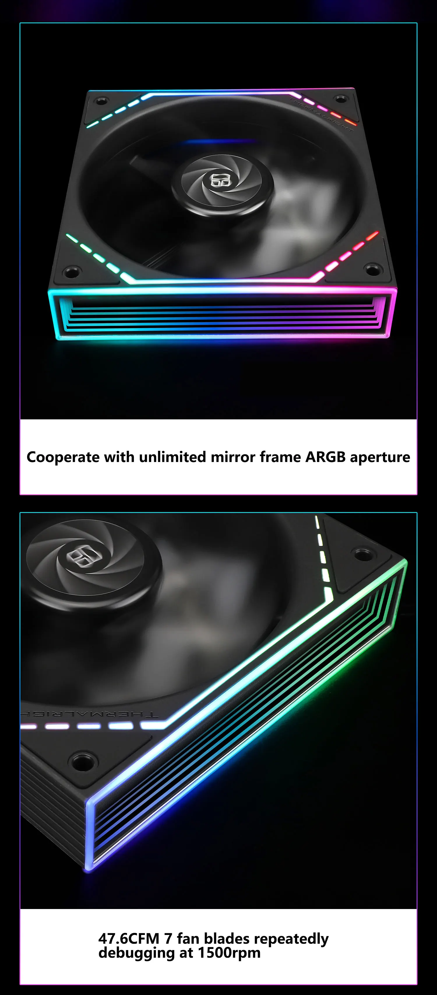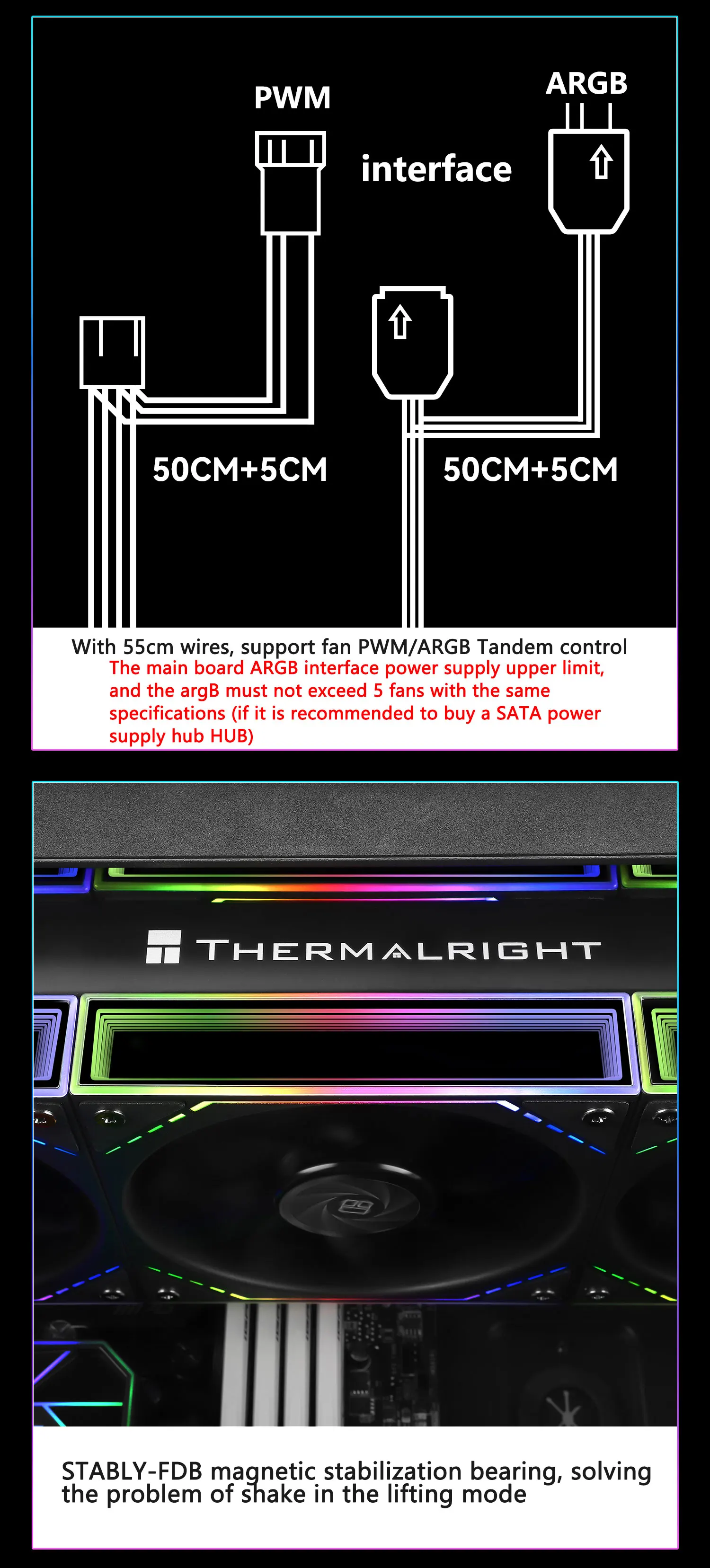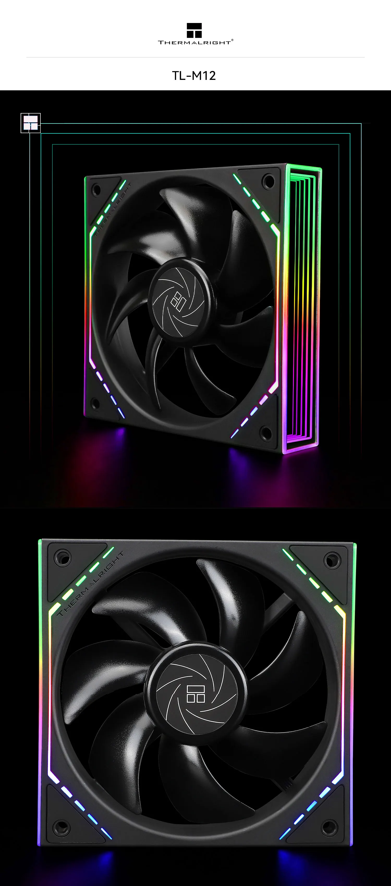 Ventilador único para completar la configuración. El ventilador tiene una conexión de 4 pines para alimentación y una de 3 pines ARGB para efectos de iluminación. Silencioso, recomendado.