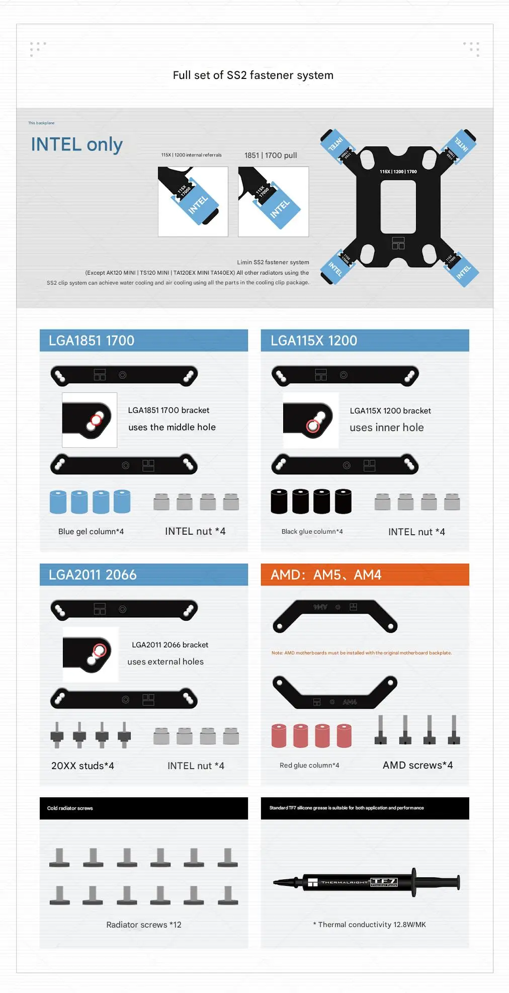 El radiador de refrigeración por agua es compatible con Intel: LGA 1851/1150/1151/1155/1156/1200/1700/2011 CUADRADO/2066, AMD: AM4/AM5, combinado con hebillas metálicas de doble plataforma para una fácil instalación, se recomienda instalarlo junto con la instalación. vídeo o manual.