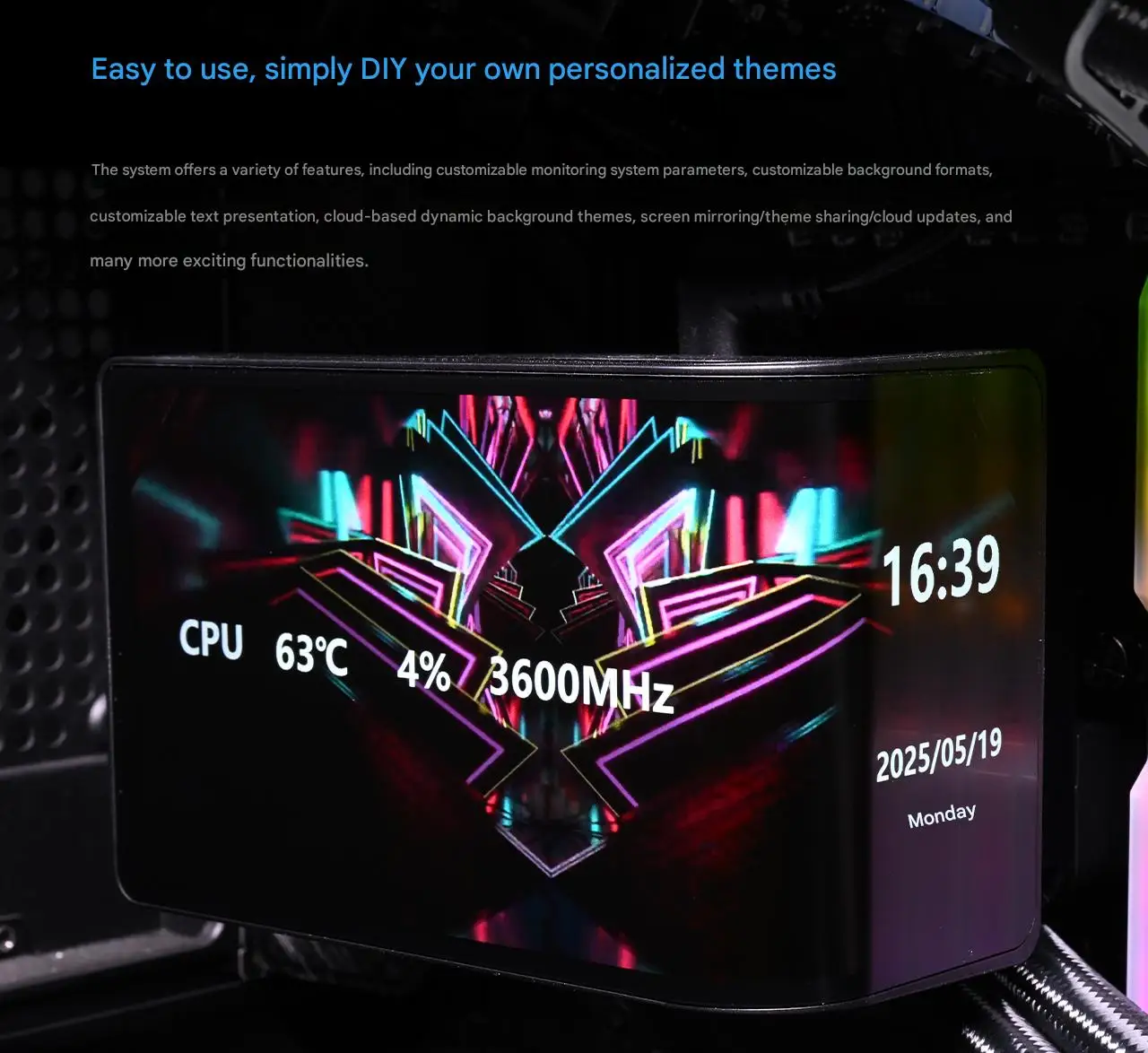 Der 3D-gekrümmte Bildschirm unterstützt die Anzeige von 3D- und 2D-Videos, dynamischen Bildern und statischen Bildern.Der AMOLED-Bildschirm verfügt über empfindliche Farben, die die Echtheit der Farben genau wiederherstellen können.Sie können Themen frei selbst gestalten, verschiedene Parameter des Überwachungssystems anzeigen, statische und dynamische Hintergrundthemen selbst gestalten und die Präsentation von Text frei definieren.