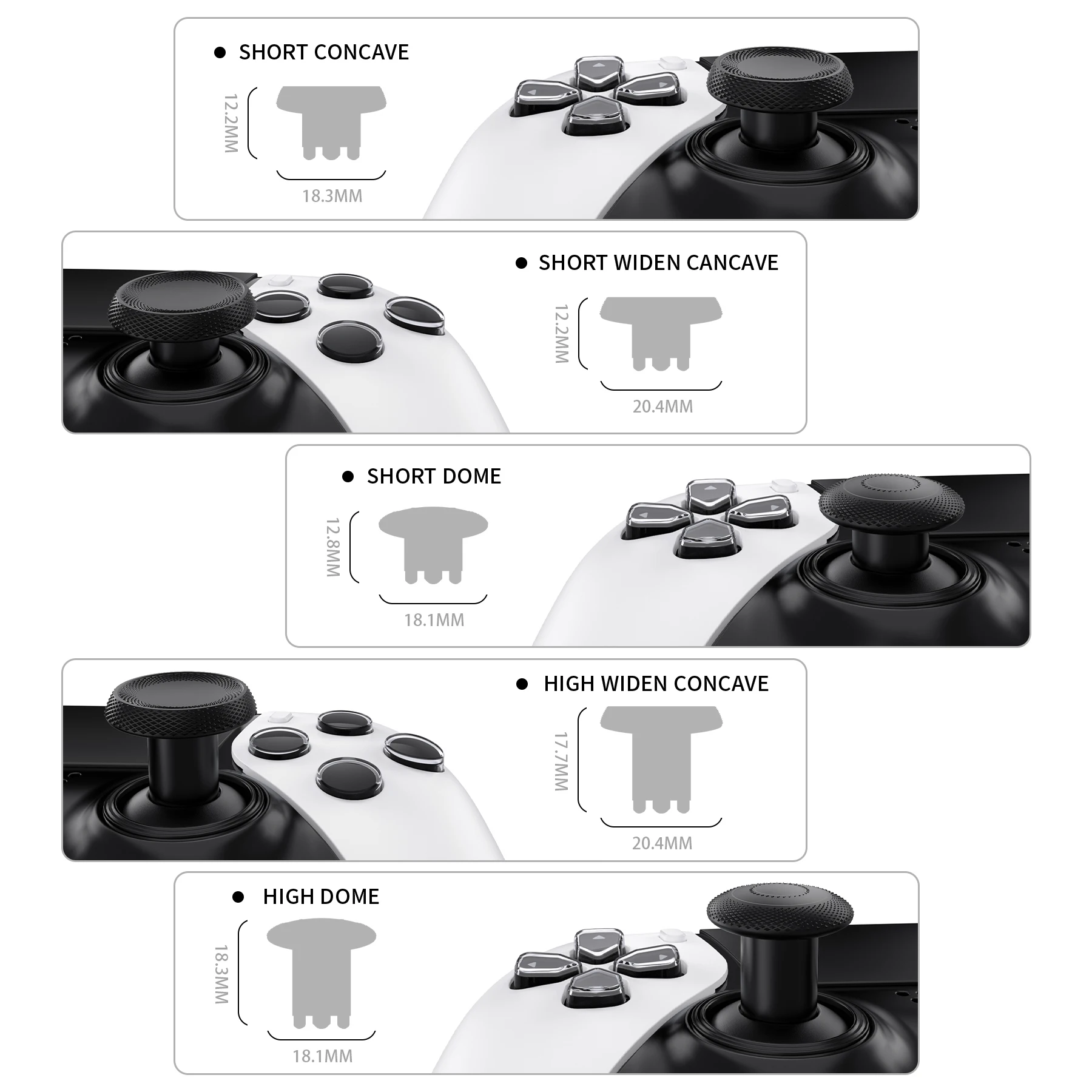 Hay 3 diseños de superficie de tapa de joystick:3 convexos, 2 cóncavos y 3 cóncavos ensanchados.La superficie cóncava proporciona la máxima comodidad, mientras que la superficie convexa mejora la precisión y la sensibilidad.