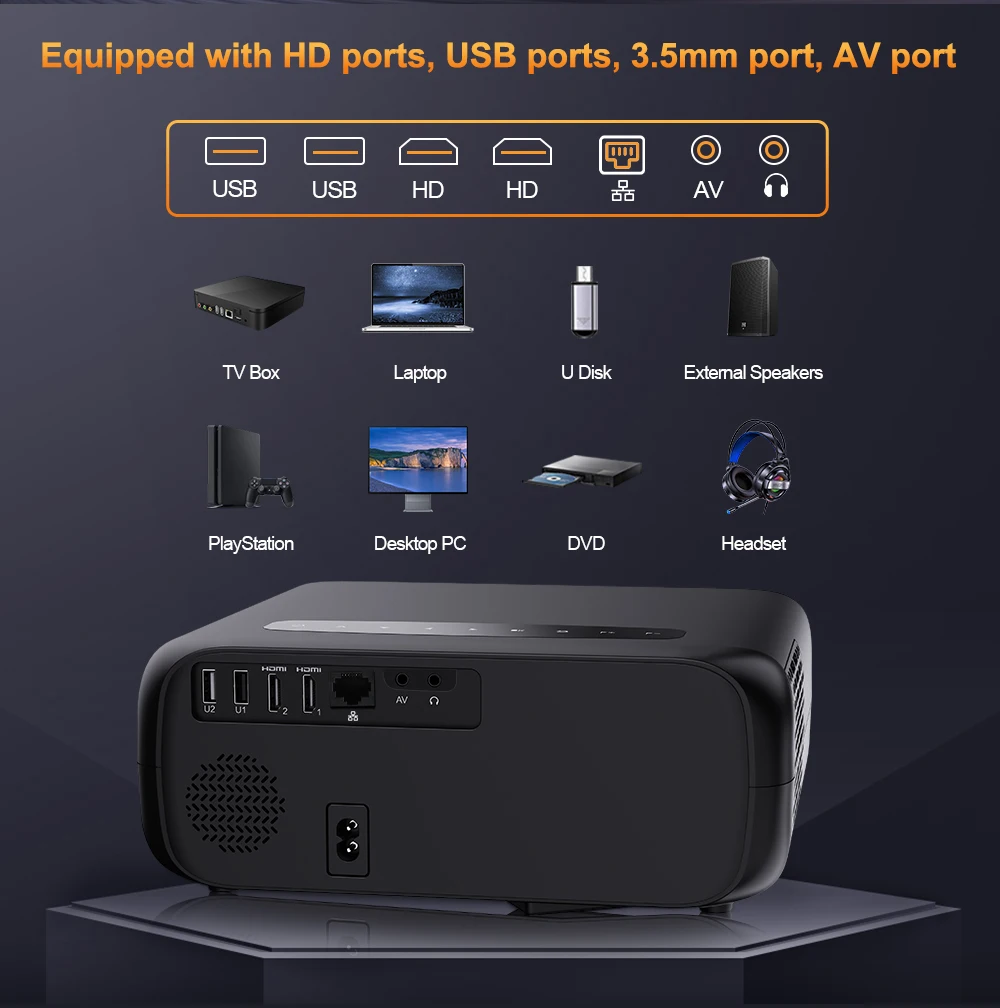 El proyector es compatible con TV BOX, TV Stick, computadora portátil, USB, computadora, PS3, PS4, Switch, etc.