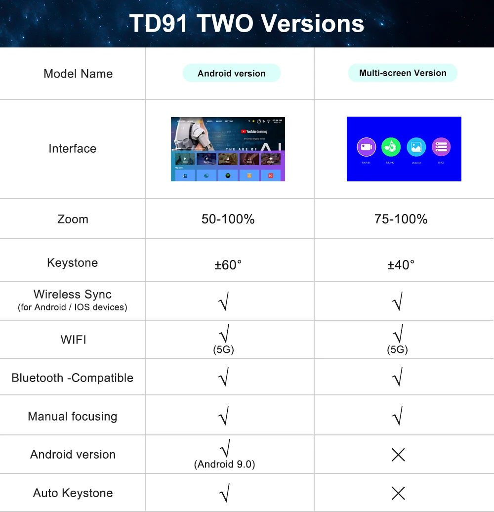 TD91W Android Versión 6D Innovador KeystoneCorrección yConZoom 100-50%Función