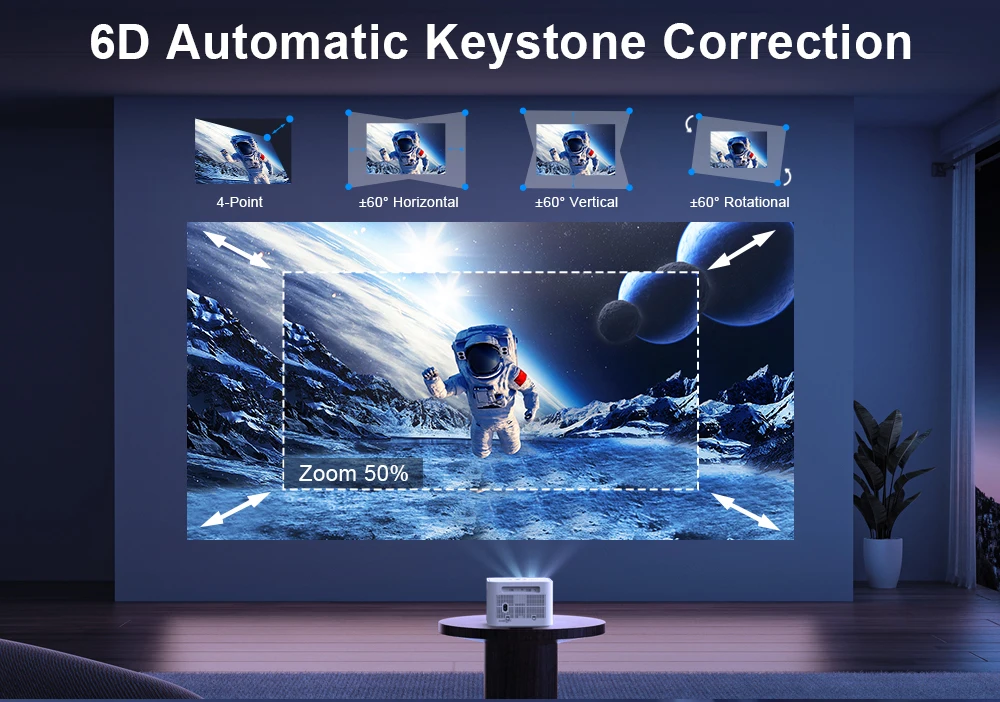 -6D Keystone: admite corrección trapezoidal eléctrica de esquina de 4 puntos para Proyección lateral, izquierda y derecha 60 grados, arriba y abajo 60 grados yAuto Vertical Keystone +/-60 grados