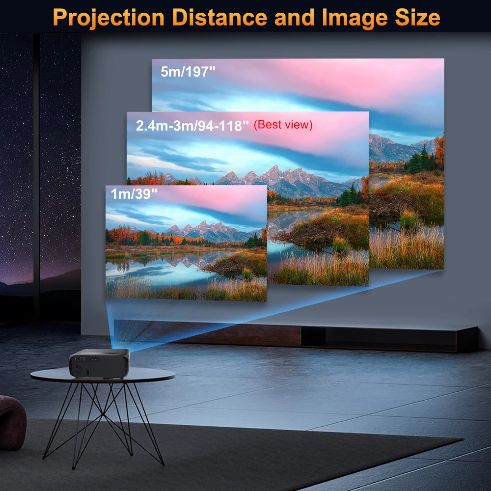 Este proyector 1080P 2K 4K admite una distancia de proyección de 1 a 8 metros para lograr un tamaño de proyección de 50 a 300 ".