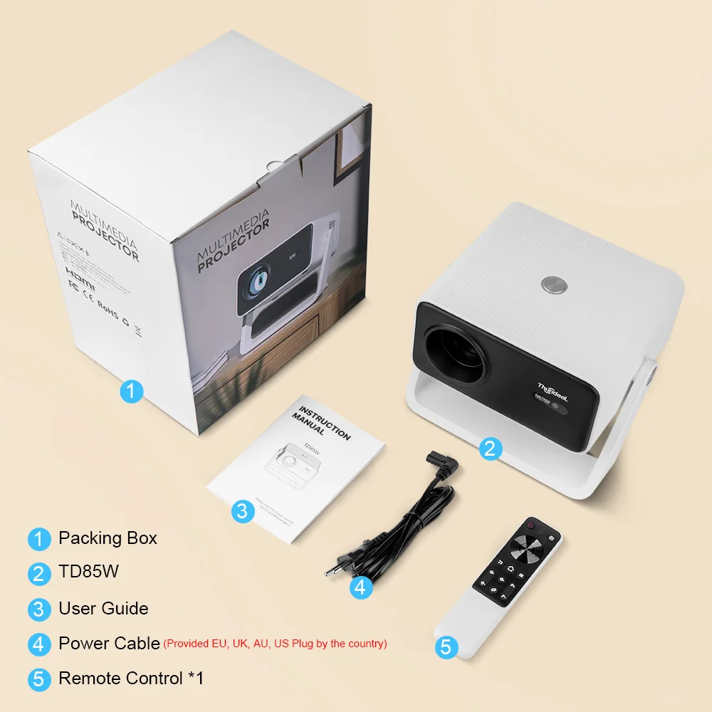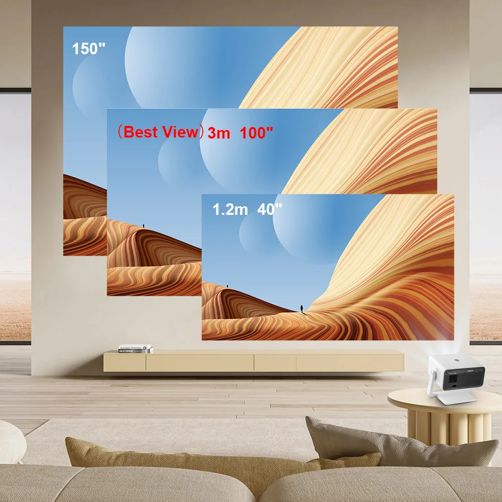 Pantalla súper grande de 40-150 pulgadas, que ofrece flexibilidad en la ubicación y sin limitaciones de espacio.Para una experiencia óptima, recomendamos una distancia de visión de 3 metros para lograr mejor una experiencia impresionante e inmersiva en pantalla grande, llenando toda tu imaginación en una pantalla grande.