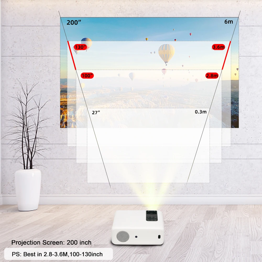 The video projector offers the projection size from 27" to 200" depending on the distance and 100-130inch is the recommended viewing distance