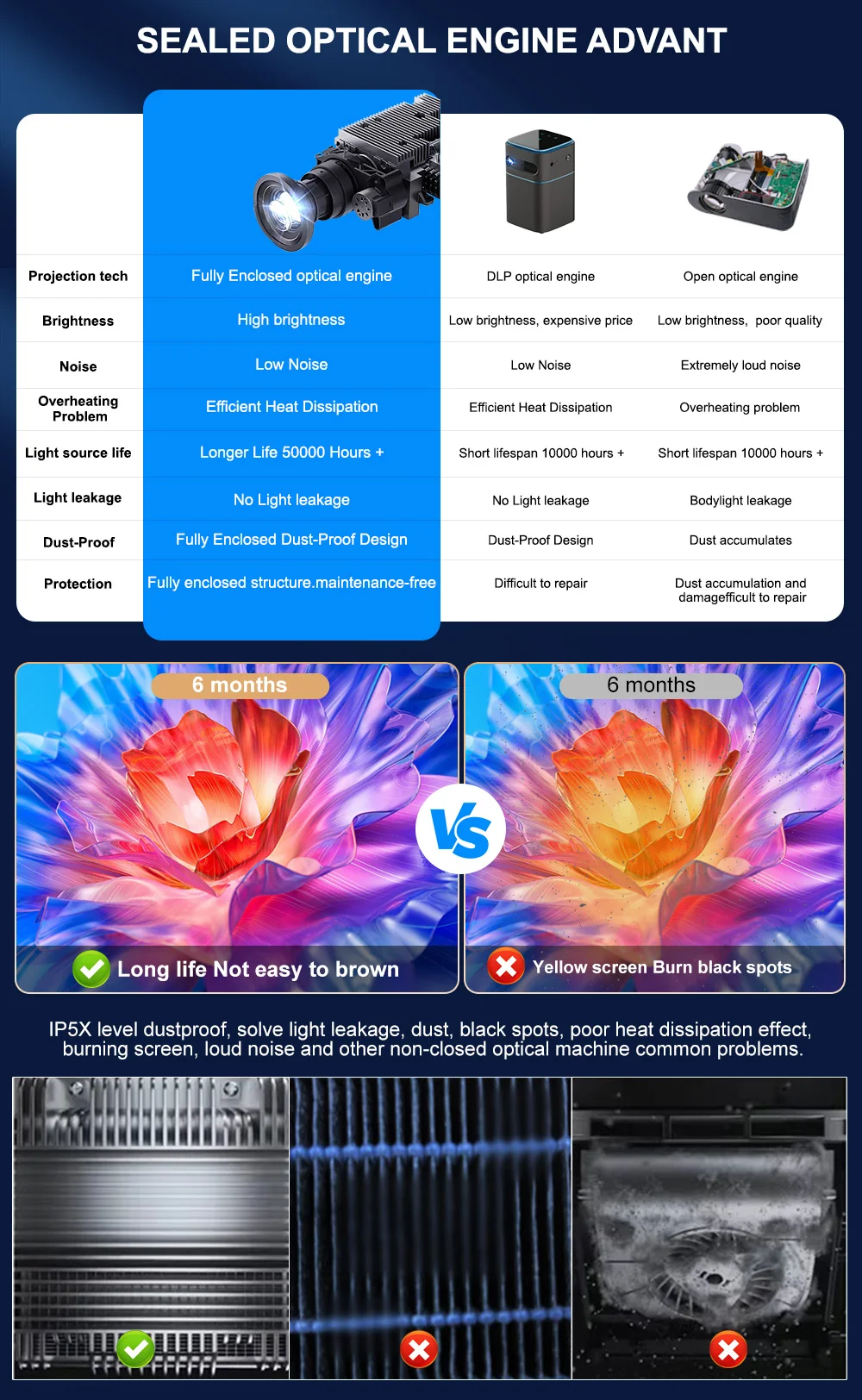 Lo más importante es que los motores ópticos completamente sellados pueden reducir los gastos de mantenimiento y también reducir el tiempo y los problemas necesarios para reparar el equipo.Fácil mantenimiento sin preocupaciones, No más puntos negros, extendiendo la vida útil del proyector a un máximo de 50.000 horas.