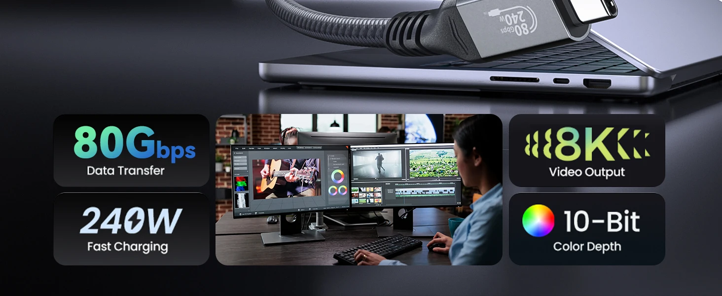 【240W PD3.1】Con una potencia de suministro de 48V/5A, el cable de 240W para Thunderbolt 5 puede admitir hasta 240W de suministro de energía, lo que permite la carga rápida de dispositivos compatibles.