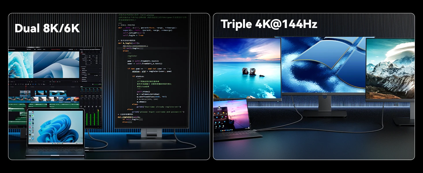 【Múltiples configuraciones de pantalla】Obtenga una experiencia visual extraordinaria con una resolución máxima de 16K.Conecte pantallas duales de 8K/6K o triples de 4K a 144 Hz para brindar una claridad nítida y detalles precisos, lo cual es ideal para diseñadores gráficos y profesionales multimedia.Hasta 4K@480Hz, reduce el desgarro, el arrastre y el retraso de la pantalla y mejora la suavidad y capacidad de respuesta del juego.Admite cadena en forma de margaritas para crear una potente estación de trabajo.