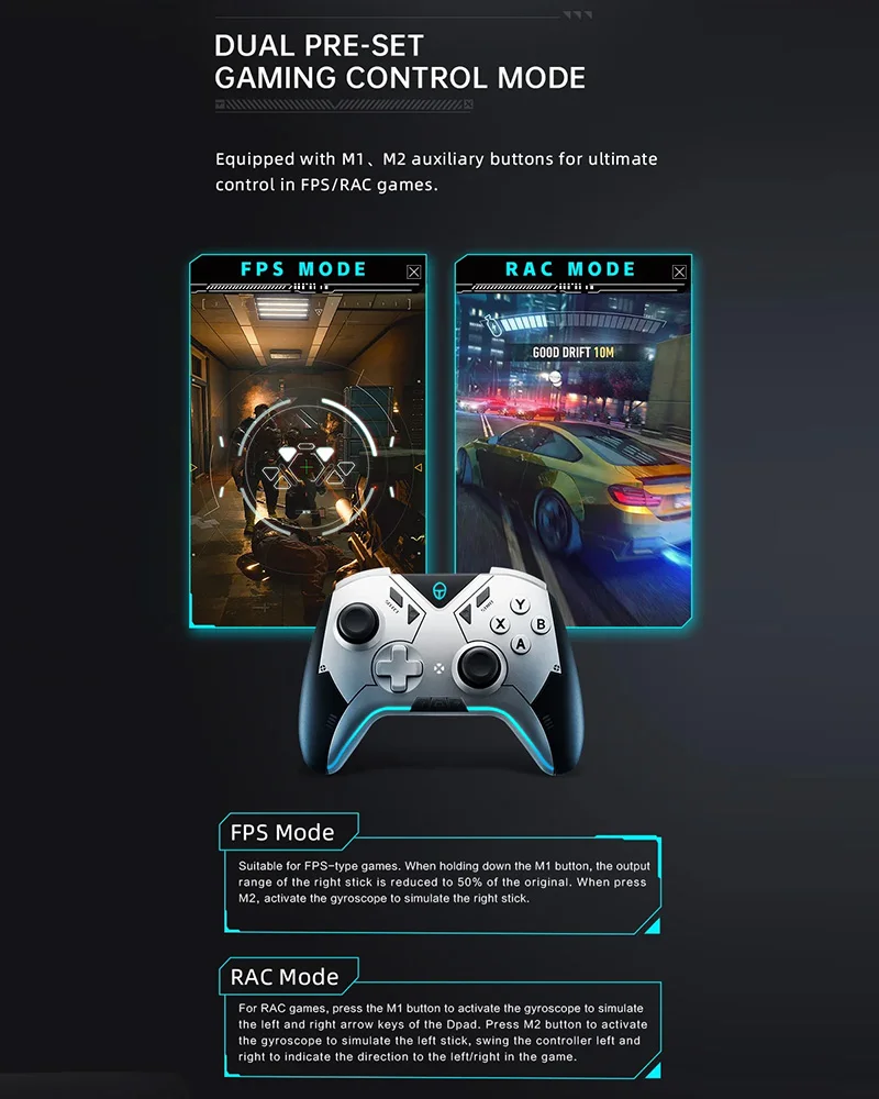Función personalizada: proporciona dos modos de juego personalizados: Modo de asalto y modo rápido, optimizando los juegos de disparos FPS y los juegos de carreras respectivamente.
