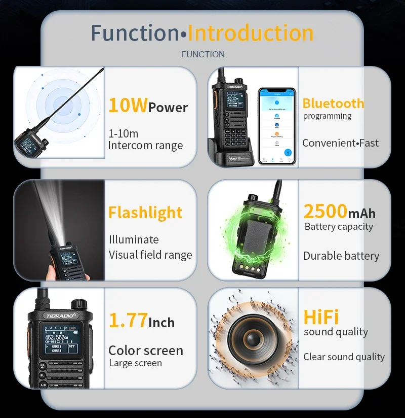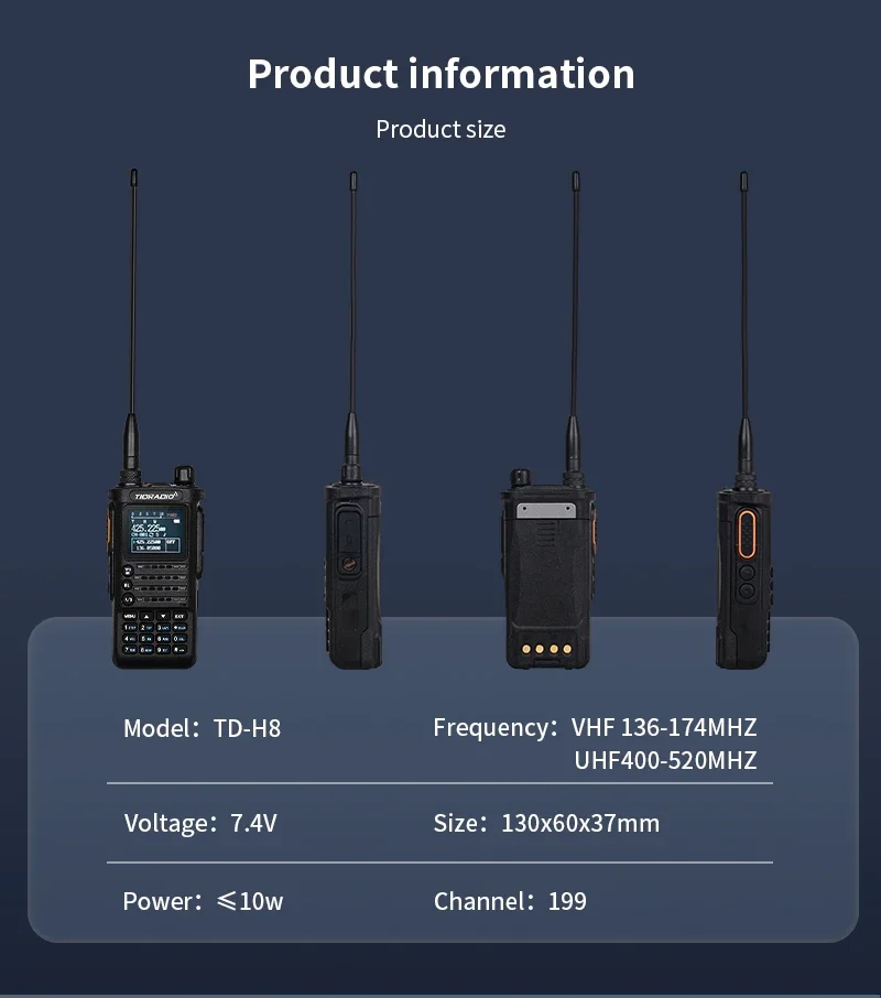 ✅[Radio portátil TD-H8] Esta radio bidireccional portátil cuenta con una potencia de salida de 10 vatios, una batería recargable de 2500 mAh y una increíble pantalla a color de 1,77 pulgadas.Y lo más importante es que el TD-H8 está tomando la iniciativa de la programación inalámbrica, permite al usuario personalizar la radio minuciosamente a través del teléfono, sin la limitación de la PC y el cable de programación, dedicado a brindar una mejor experiencia al aire libre para los usuarios globales con entusiasmo por radio.