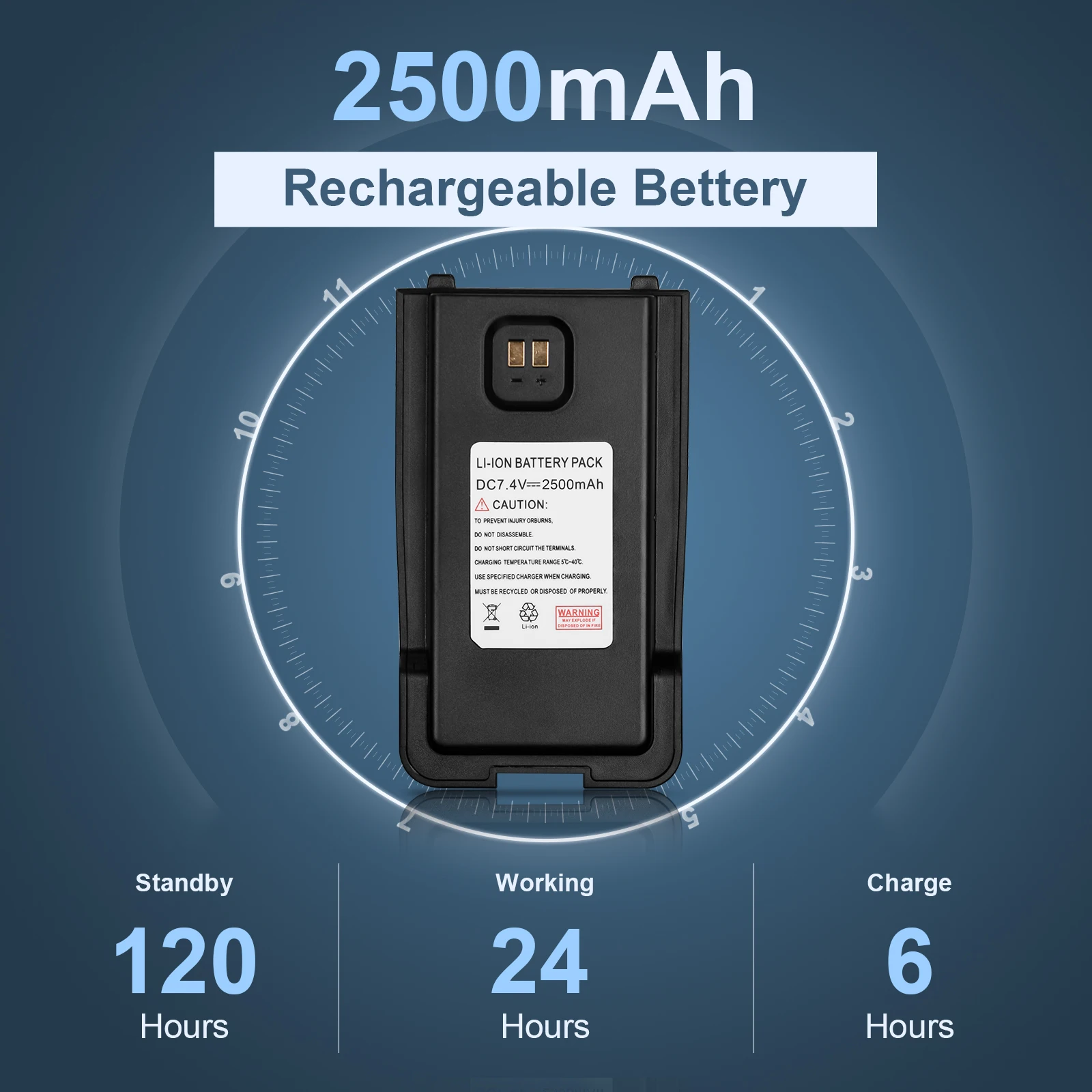 ✅[Batería de 2500 mAh] Batería recargable de iones de litio de 2500 mAh, mayor capacidad cuando se compara con los walkie talkies baofeng normales Batería de 1800 mAh.Una batería más grande admite 12 horas de uso continuo y 60 horas en espera.La función de ahorro de energía puede extender aún más el tiempo de radio de 10 vatios.